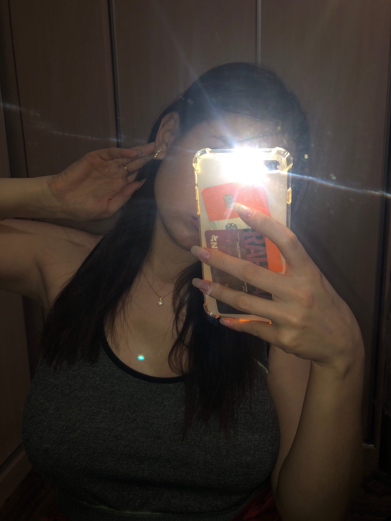 A woman is taking a selfie in a mirror. She is holding a phone with a clear case that contains cards, including one that appears to say "KAHRA". She is wearing a gray tank top. She has long dark hair,…read more