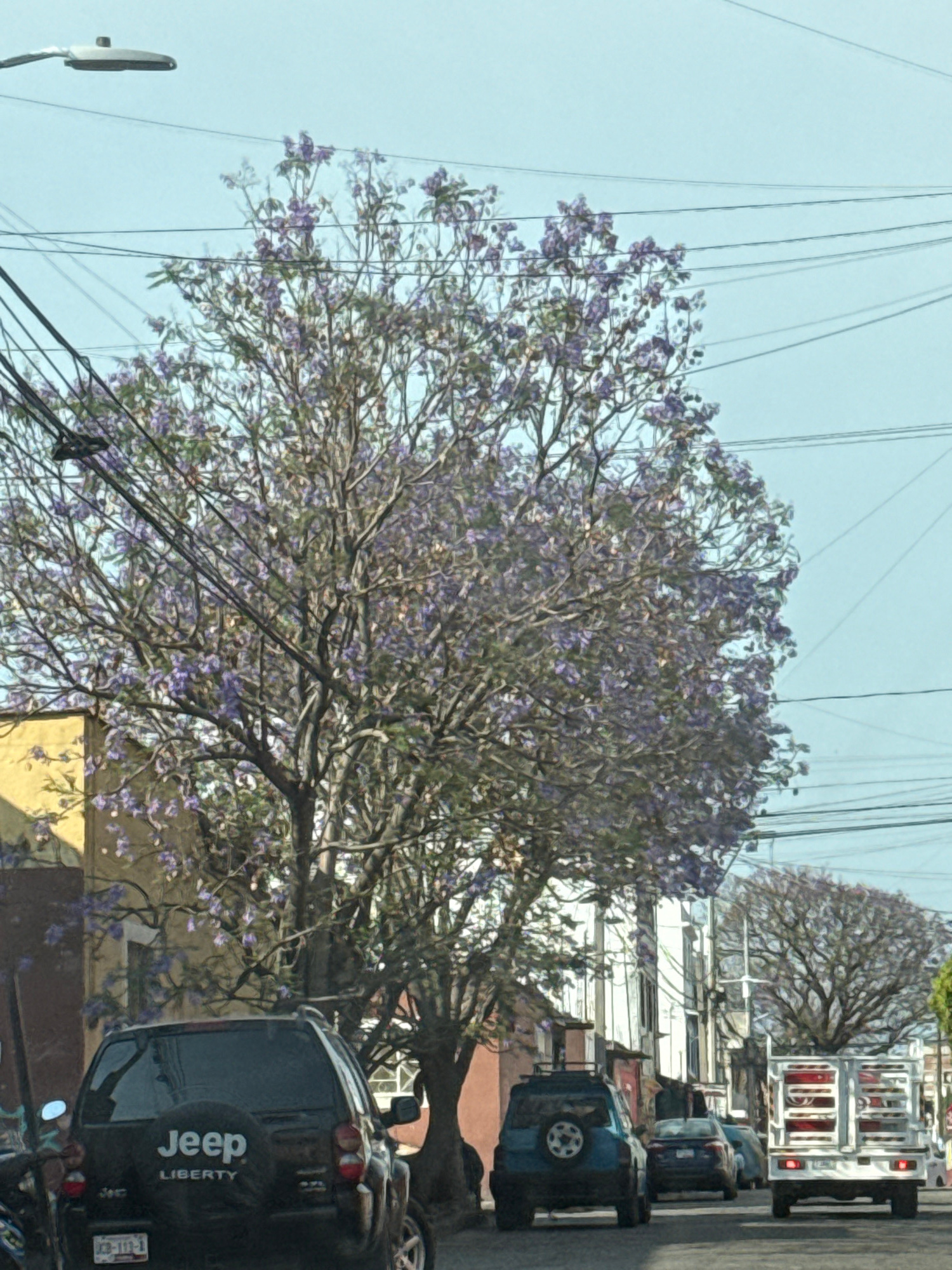 A street scene in Cholula, Mexico, featuring a blooming jacaranda tree with purple flowers prominently in the foreground. Power lines crisscross the sky above. A dark Jeep Liberty is parked on the rigβ¦read more