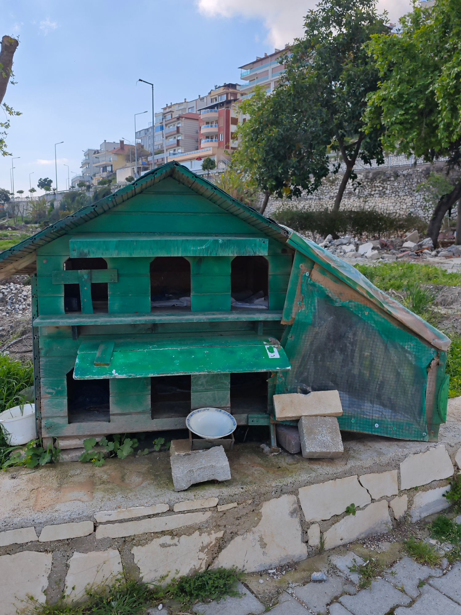 The image shows a green wooden birdhouse with multiple compartments, situated in an outdoor urban environment. The birdhouse has a traditional roof design and appears weathered. In front of the house…read more