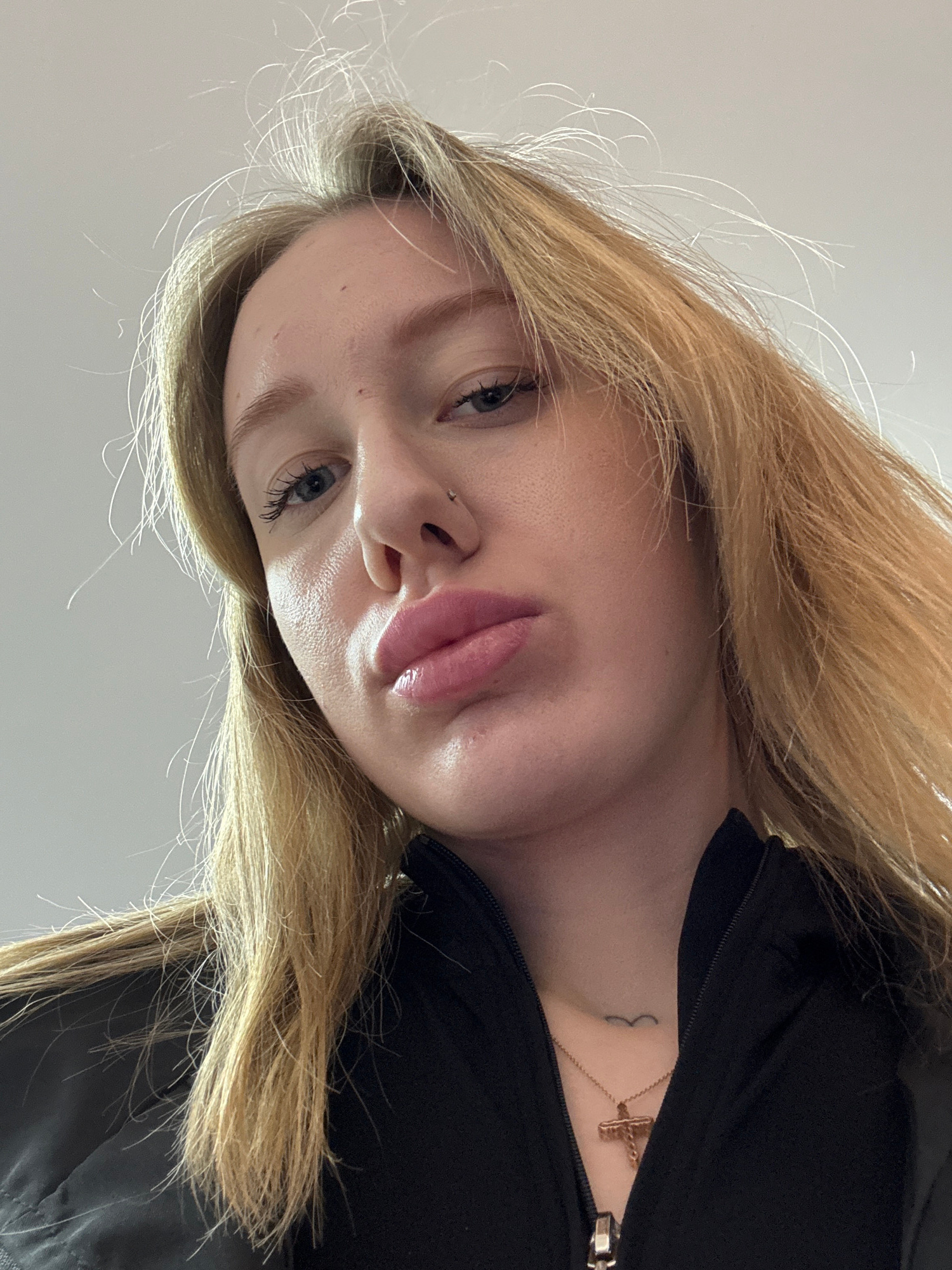 A blonde woman with fair skin and blue eyes is looking down at the camera. She has a nose piercing and appears to be wearing lip gloss. Her hair is parted on the side, and she is wearing a black jacke…read more