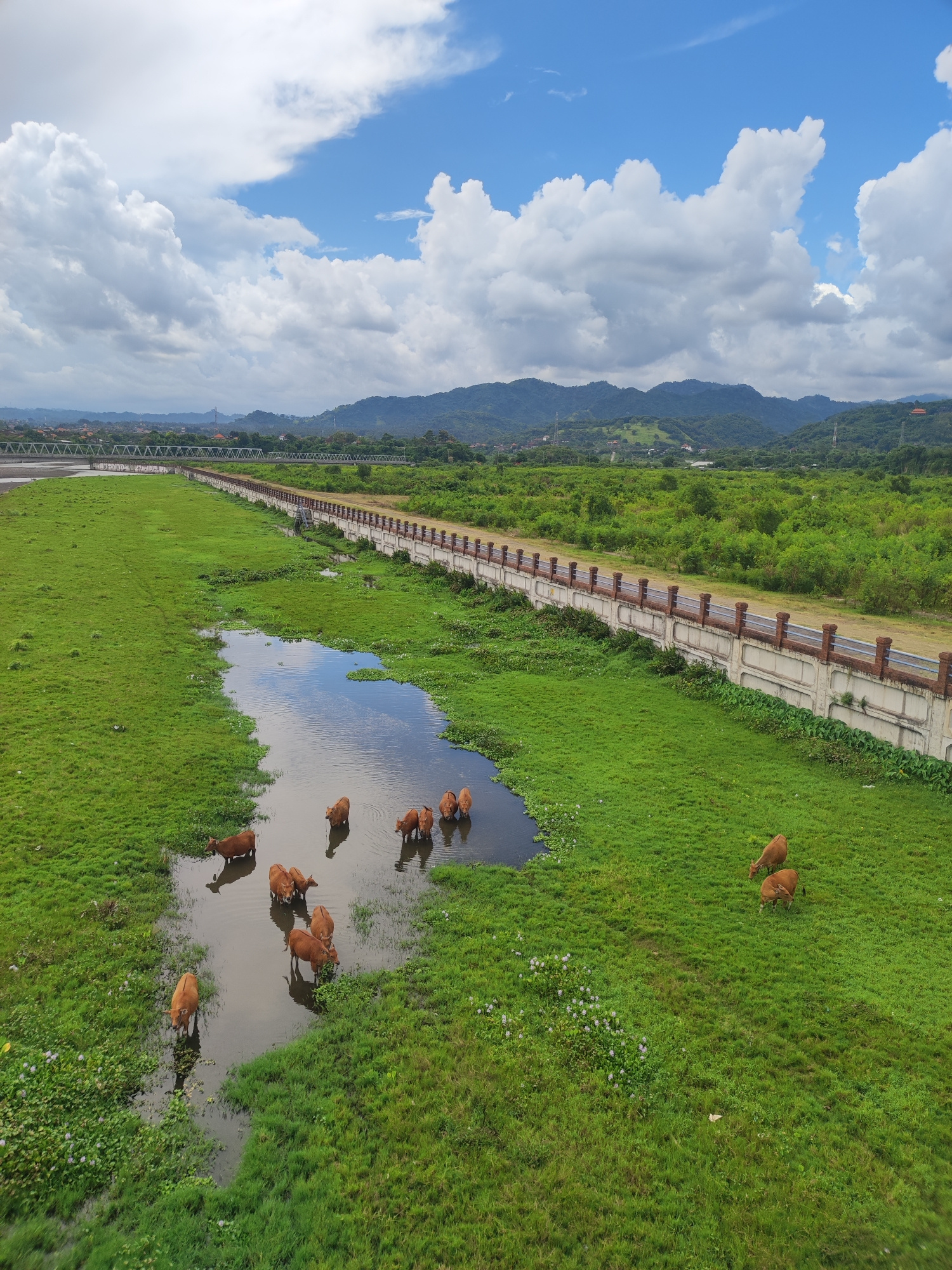 The image depicts a wetland scene in Jumpai, Indonesia, featuring a group of brown cows. The cows are distributed between shallow water and grassy areas. Some are standing in the water, reflecting on…read more