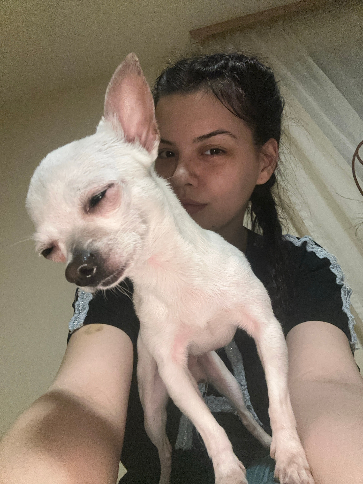 A woman with dark hair is lying down with a white dog resting on her chest. The woman is wearing a black shirt with lace trim. The dog has pink ears and a black nose. The background is a beige wall an…read more