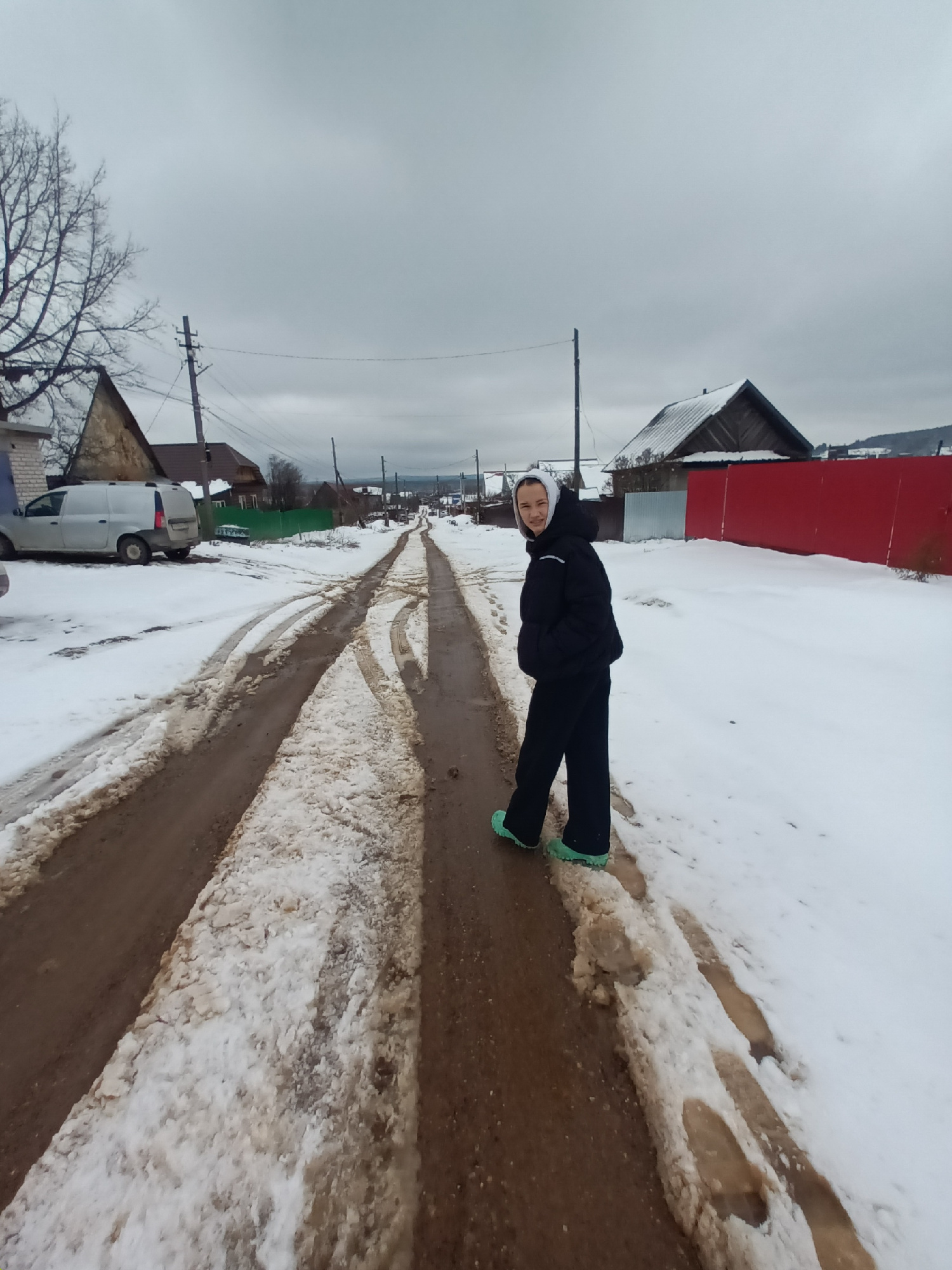 The image shows a person lying on their side on a muddy road, likely a village street. The scene is in Ольховка, Russia. Patches of snow are visible on both sides of the road, which has two tracks run…read more