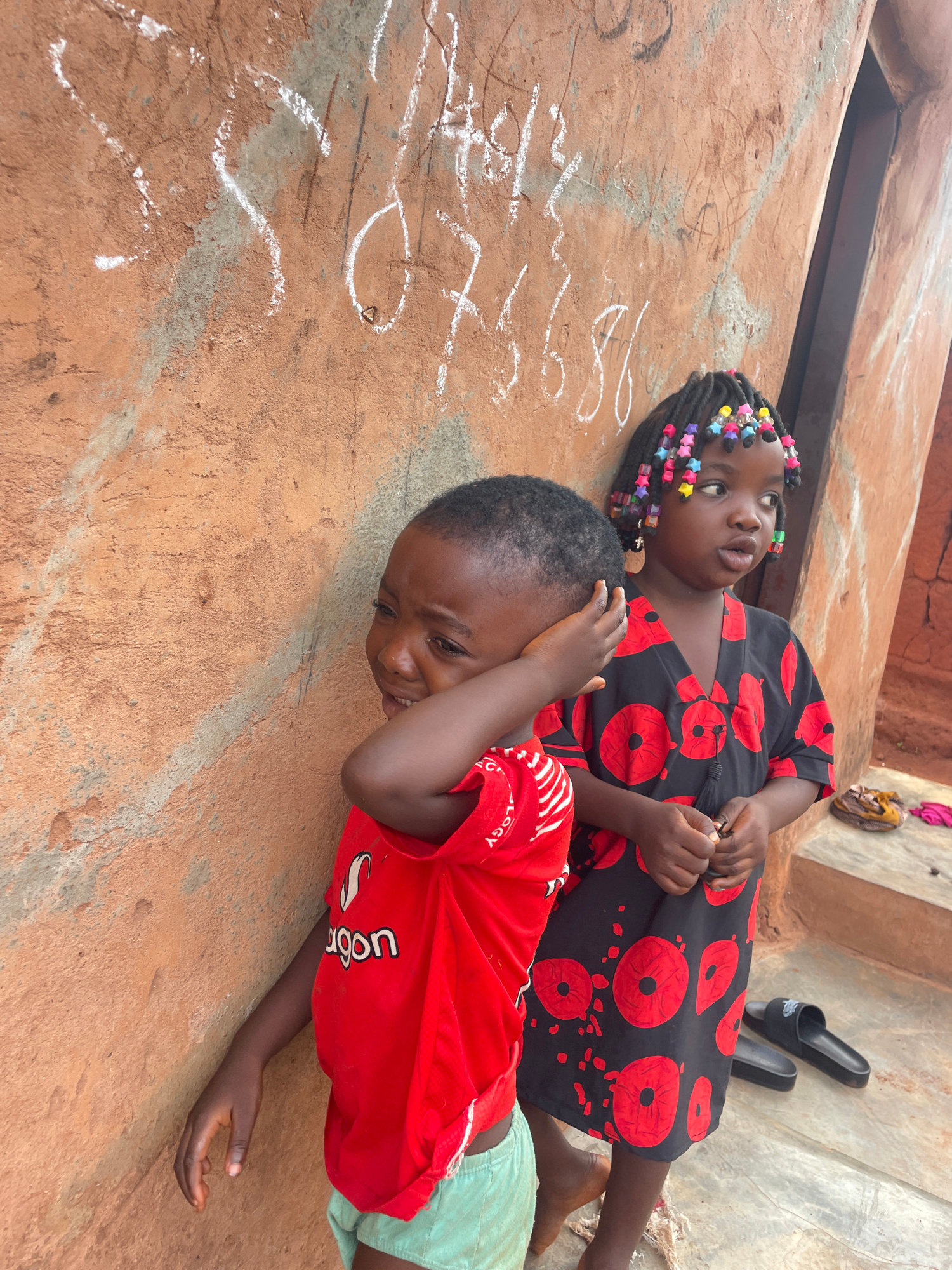 In Ogbe, Nigeria, two children are lying on a concrete surface near a reddish-brown wall with white markings. The child in the foreground is wearing a red shirt and light green shorts, and is holdingβ¦read more