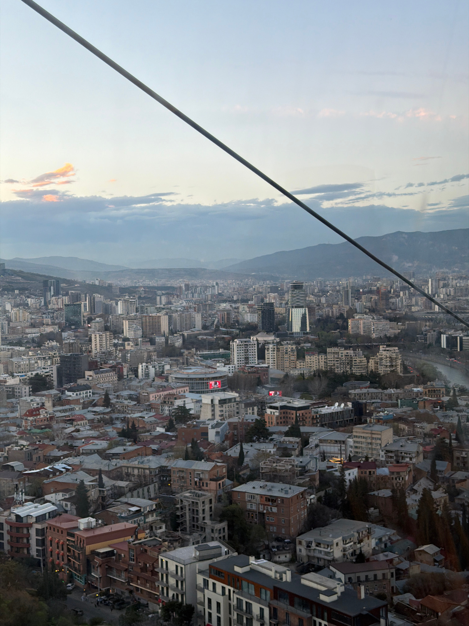 The image shows an aerial view of the city of Tbilisi, Georgia, likely taken from a cable car. The foreground features a cable wire running diagonally from the top left to the bottom center of the fraβ¦read more