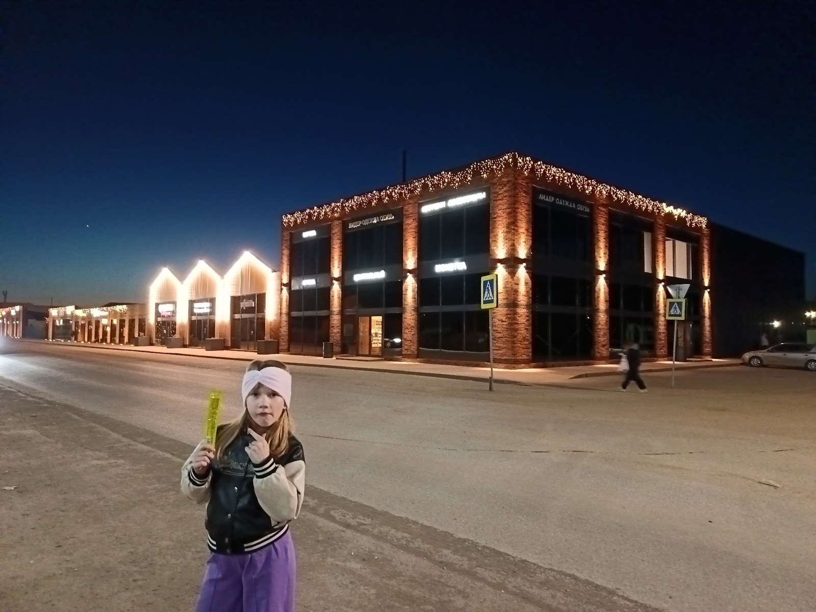 At night in Osa, Russia, a young girl wearing a pink headband, black and white jacket, and purple pants stands on an empty street. She holds a yellow, glowing stick and points to her head with her ind…read more