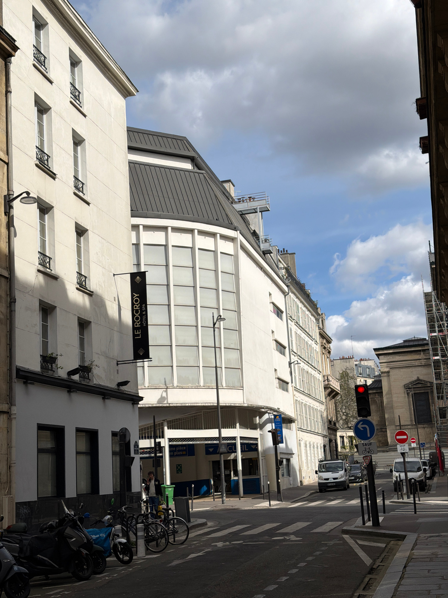 The image depicts a street scene in Paris, France. The focal point is the building displaying the "Le Rocroy Hotel & Spa" sign. The building is predominantly white with a gray roof and features multip…read more