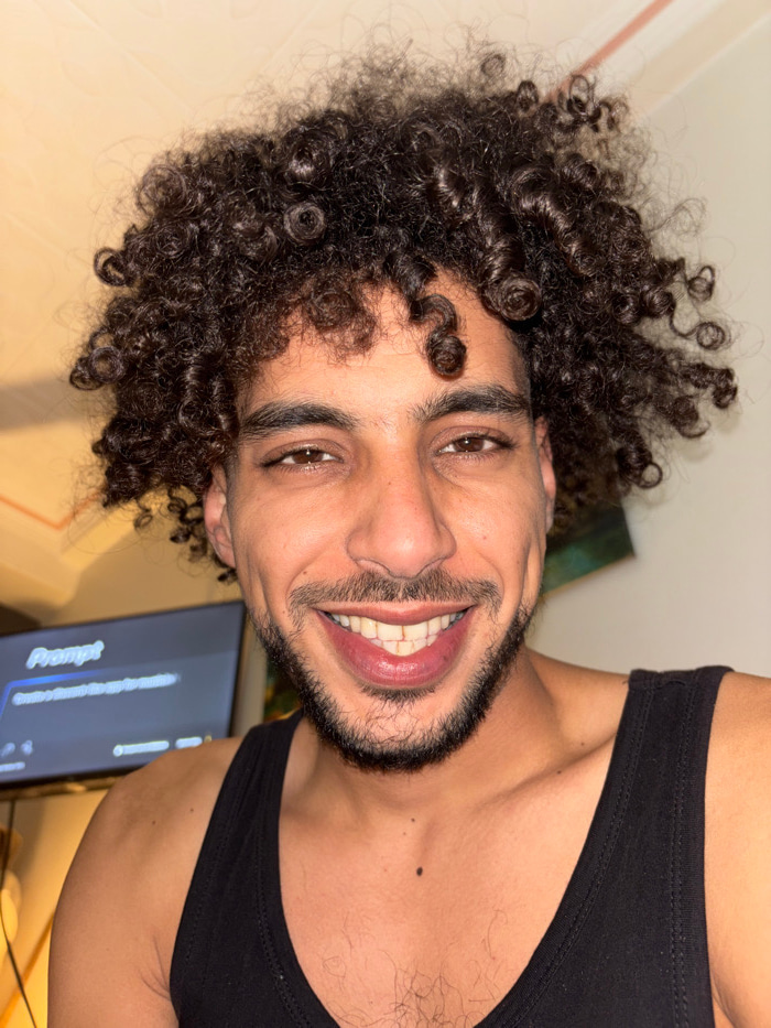 A person with curly hair and a short beard smiles broadly at the camera. They wear a black tank top. The background includes a wall and a television screen showing text. The image is slightly rotated.…read more