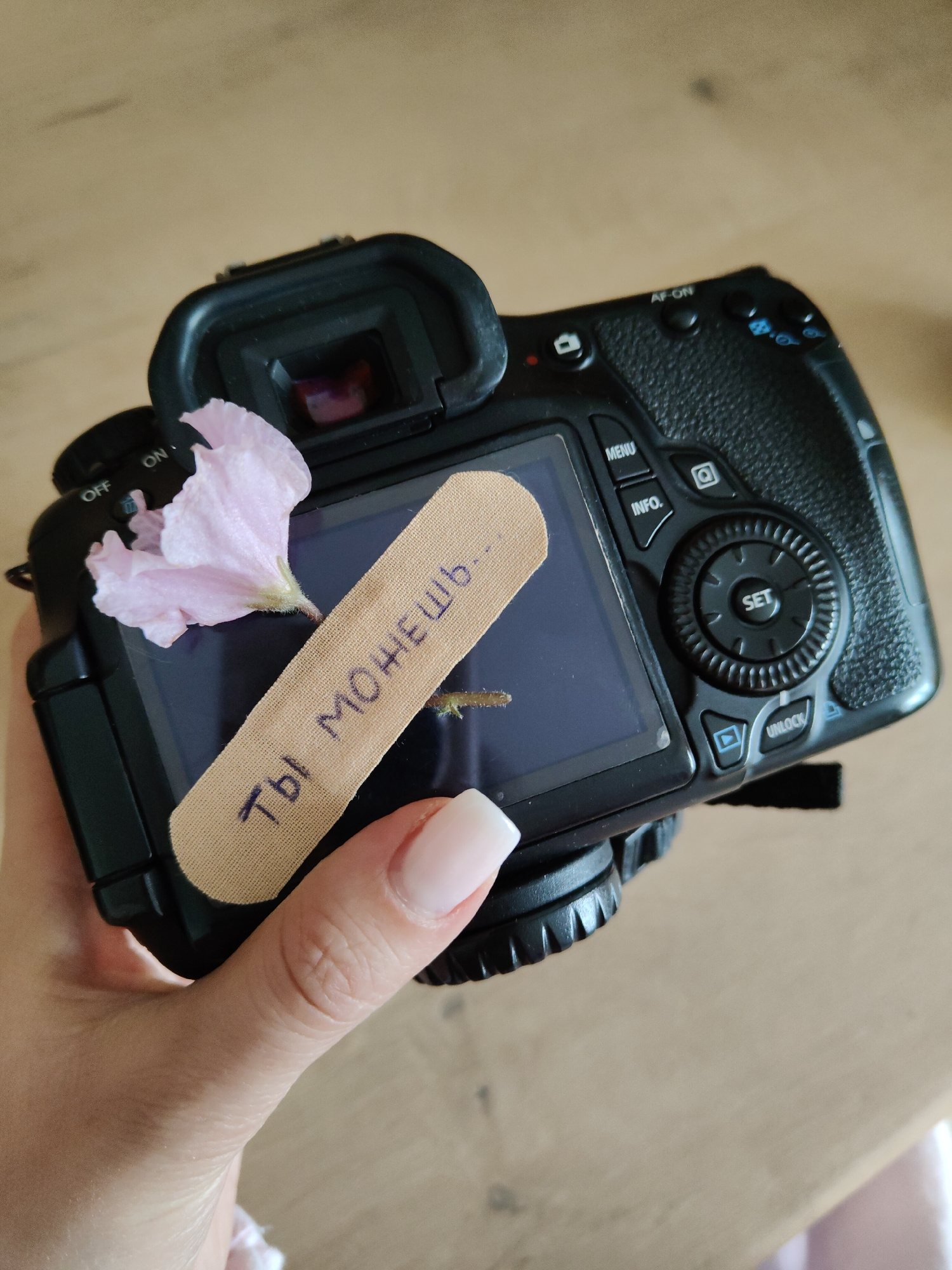 A person is holding a black digital camera in their hand. A pink flower is placed on the camera, partially covering the screen. A bandage with text written on it in what appears to be Cyrillic script…read more
