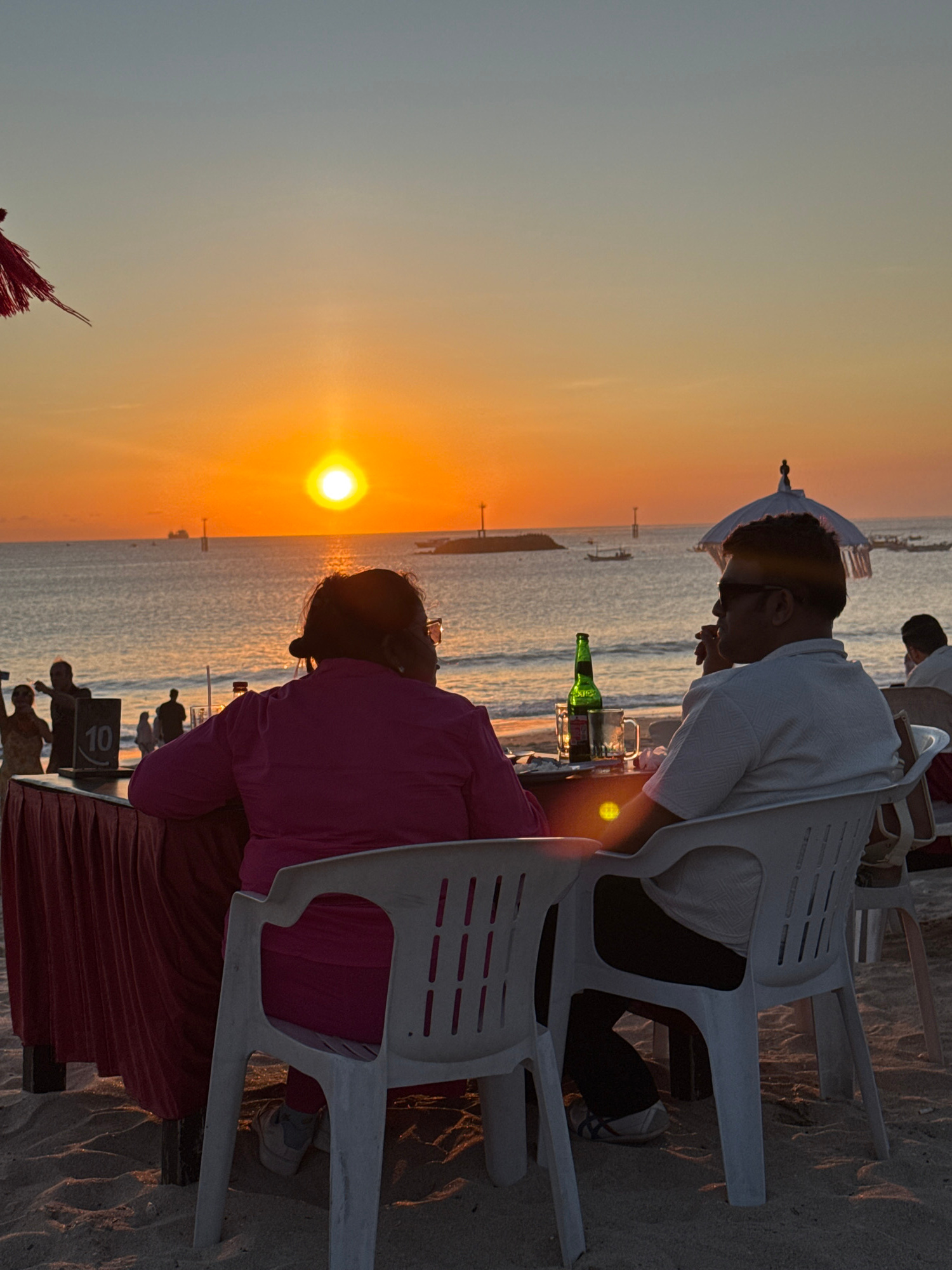 This image, presented vertically, captures a vibrant sunset over a body of water, likely a beach in Kuta, Indonesia. The sun, a bright glowing orb, is positioned on the left side of the frame, casting…read more