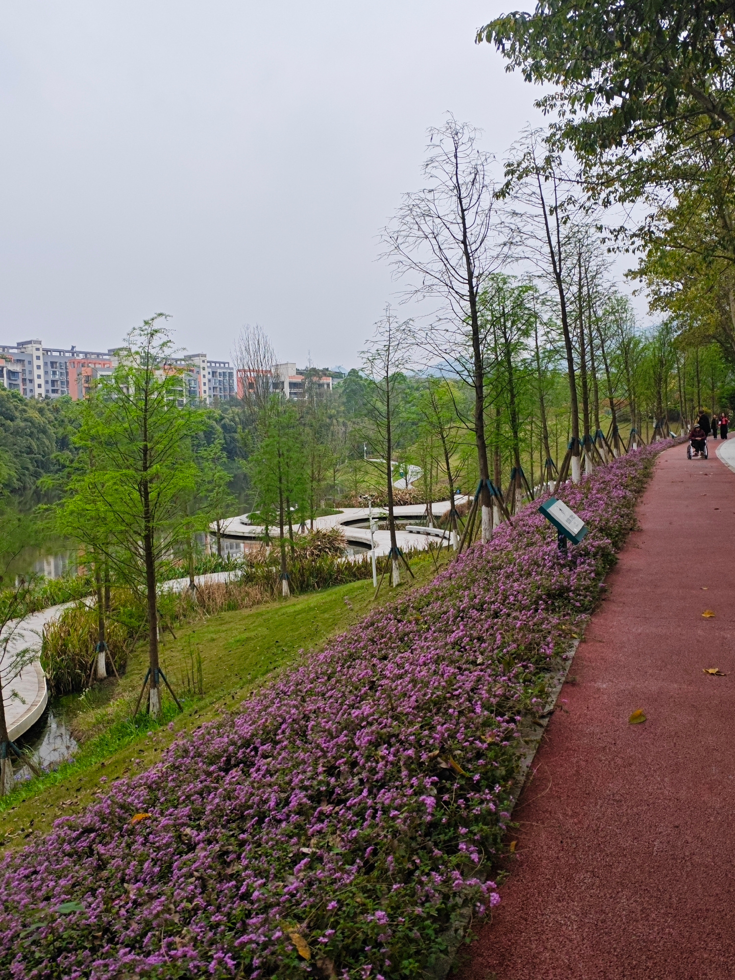 The image shows a park in Chongqing High-tech Zone, China. A red pathway runs along the right side of the frame, bordered by a dense patch of small purple flowers. Thin, young trees are spaced along t…read more