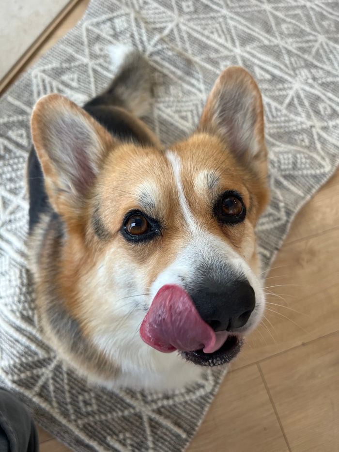 This image, captured in an indoor setting in Gangloff, Germany, depicts a tri-color Pembroke Welsh Corgi from a high-angle perspective. The dog features a tan, white, and dark brown coat, with promine…read more