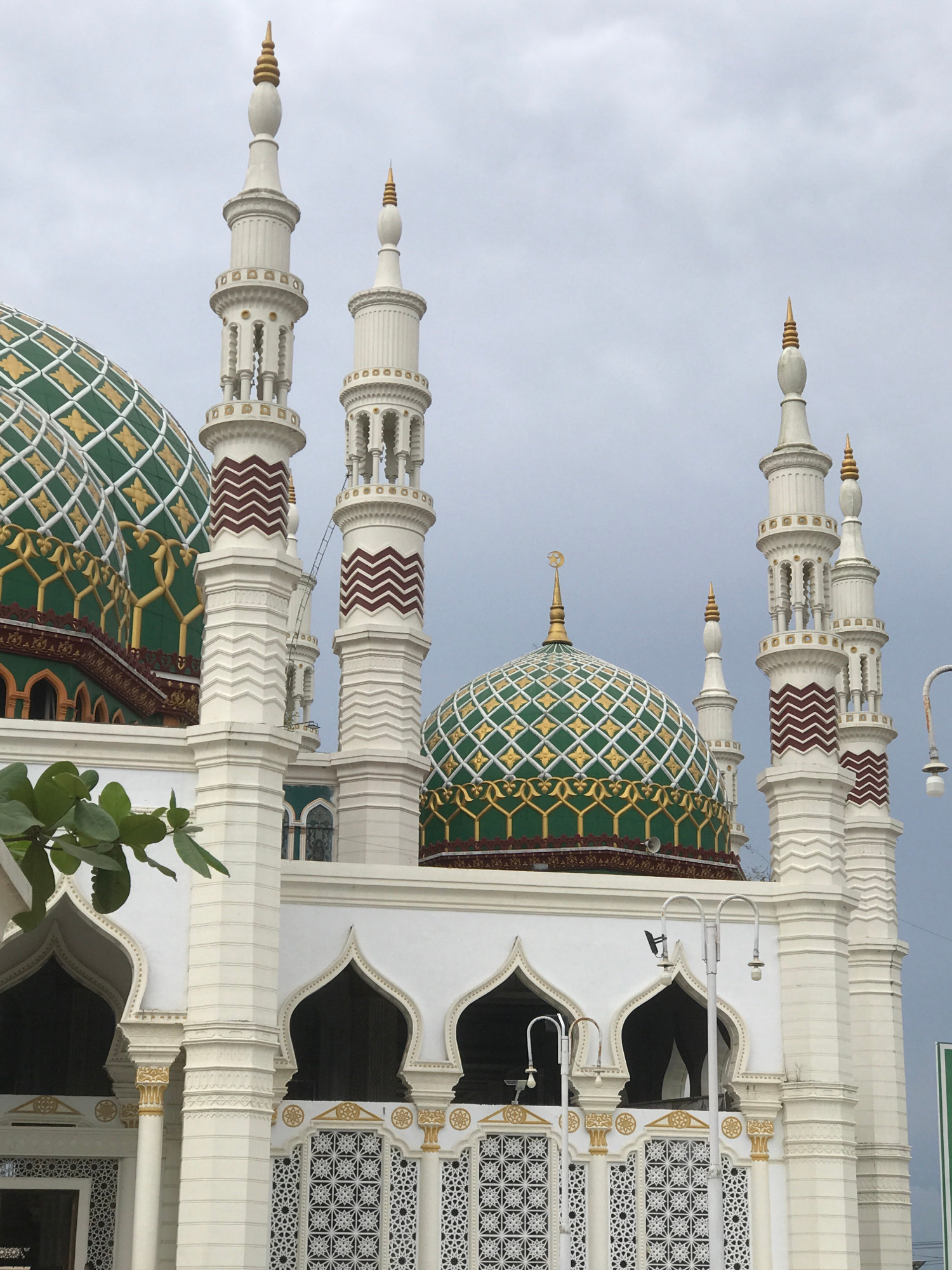 The image shows a mosque with a green and gold dome and white minarets. The sky is overcast. The building is in Kotapantonlabu, Indonesia. The architectural style is ornate. There are plants near theβ¦read more