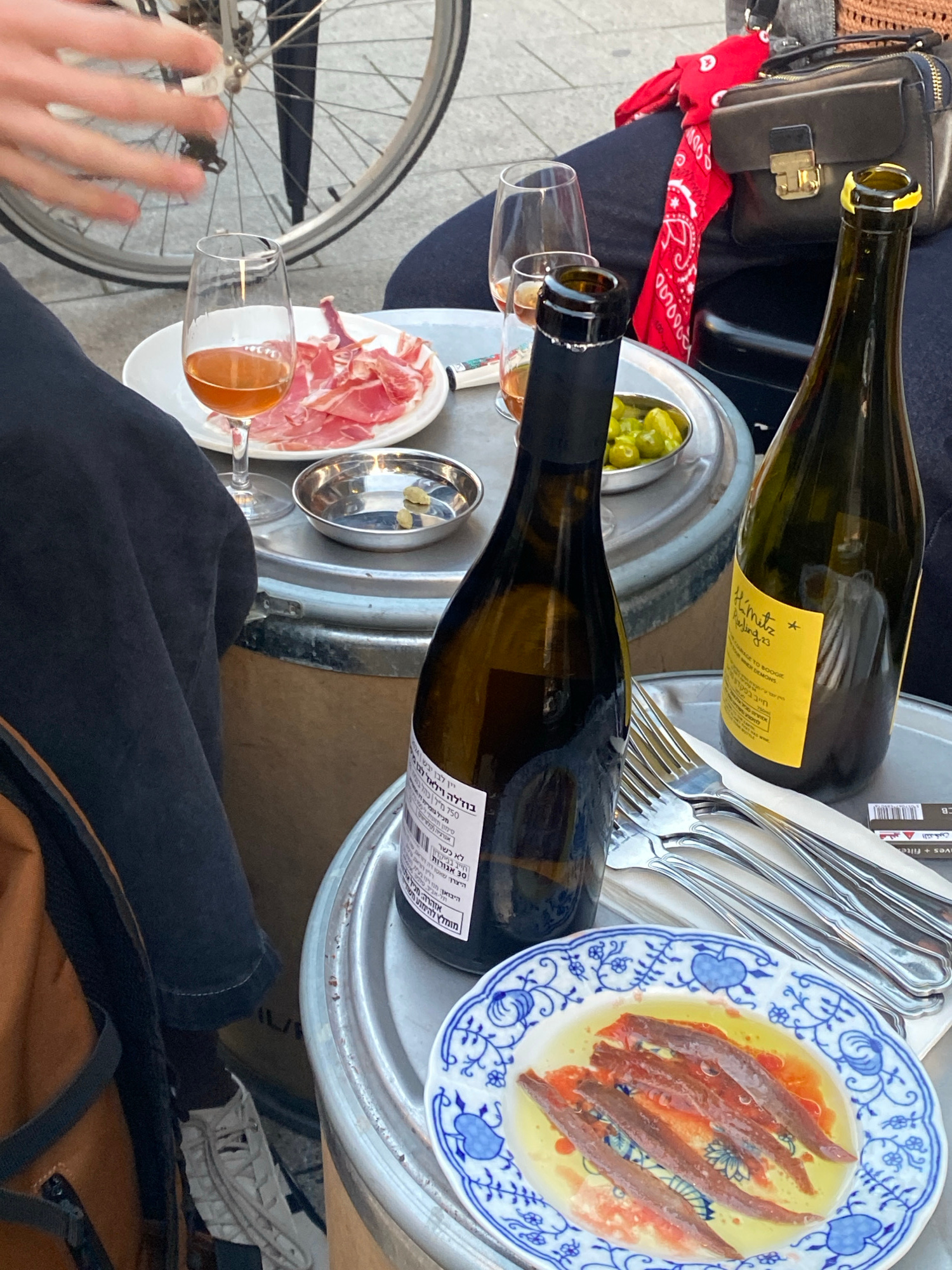 The image shows a table in an outdoor setting in Tel-Aviv, Israel. On the table, there are two wine bottles, one with a yellow label ("Himitz Riesling 23") and another with a white label in Hebrew. Th…read more