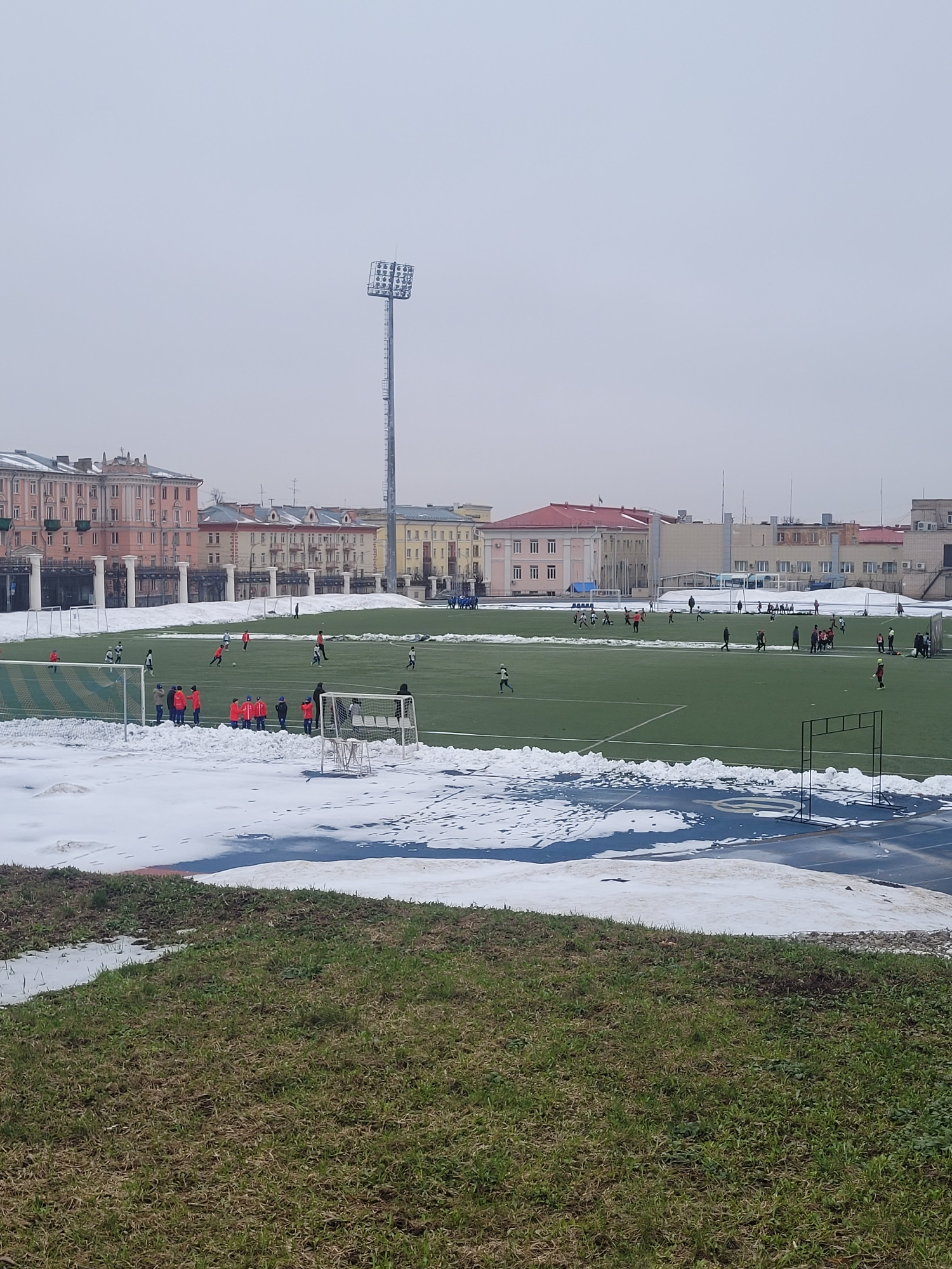 A photograph shows a soccer field with people playing soccer near some buildings on a cloudy day in Izhevsk, Russia. The field is green, but snow is visible between the field and the stadium seats on…read more