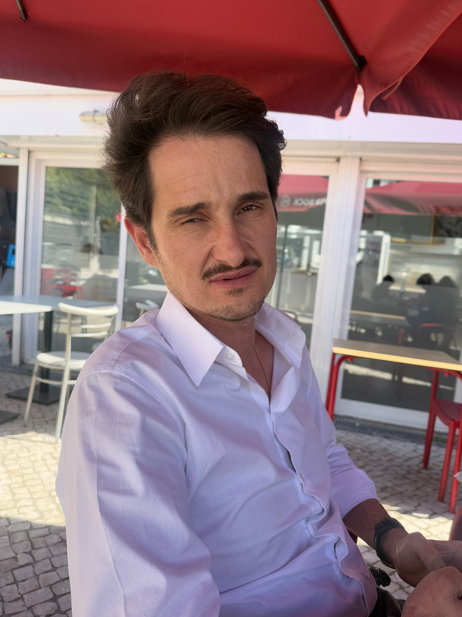 The image shows a man with dark hair and a mustache, wearing a white shirt. He's sitting outdoors at a cafe or restaurant, likely in Cascais, Portugal, as evidenced by the local "OCK" branding visible…read more
