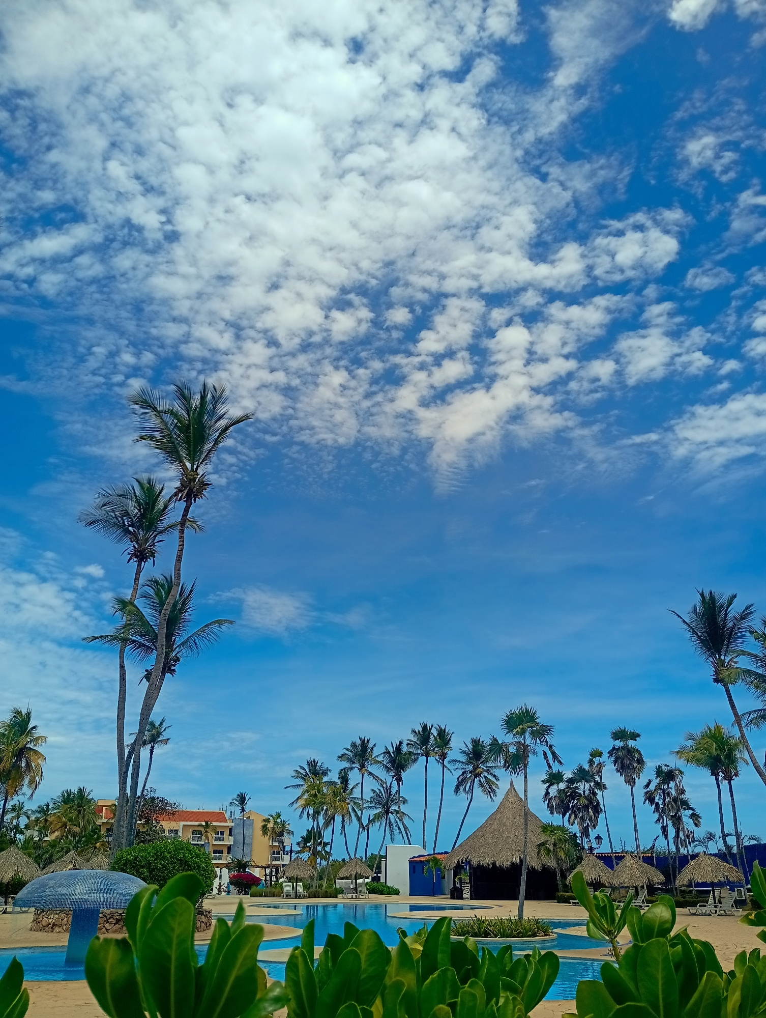 The image depicts a tropical resort scene, possibly in Playa El Agua, Venezuela, characterized by a swimming pool surrounded by palm trees and thatched-roof structures. Environment: The sky is bright…read more