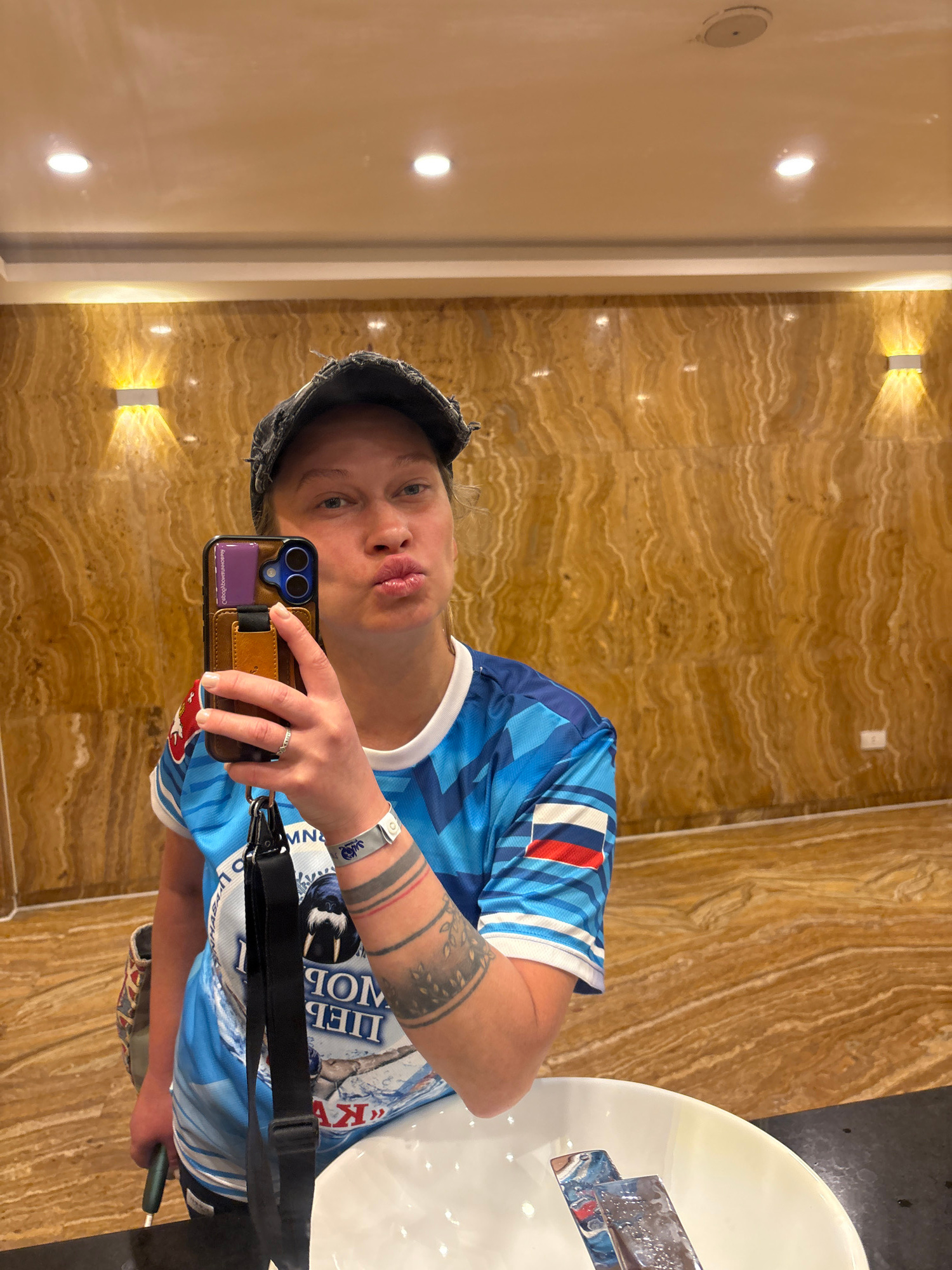 A person takes a selfie in a bathroom. The individual, wearing a blue patterned t-shirt with a white collar and a gray cap, is holding a phone with a brown case. A white sink is partially visible to t…read more