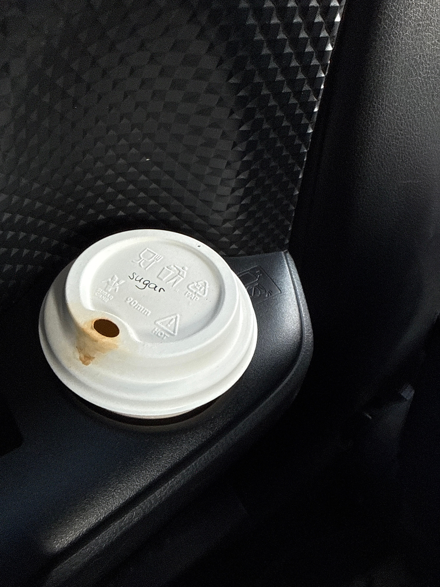 The image shows a disposable coffee cup lid resting inside a vehicle. The lid is white and has a small hole for drinking with a stain around it. Markings on the lid indicate the presence of sugar. The…read more