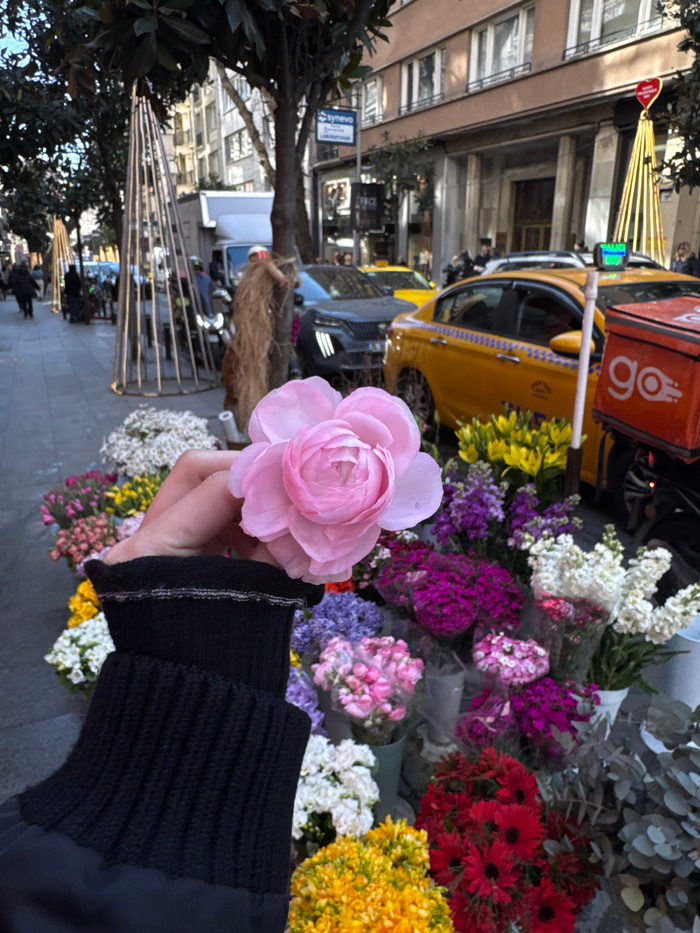 The image displays a street scene in Şişli, Istanbul, Turkey. In the immediate foreground, a light-skinned human hand, partially obscured by a black ribbed sleeve with a subtle light-colored stripe at…read more