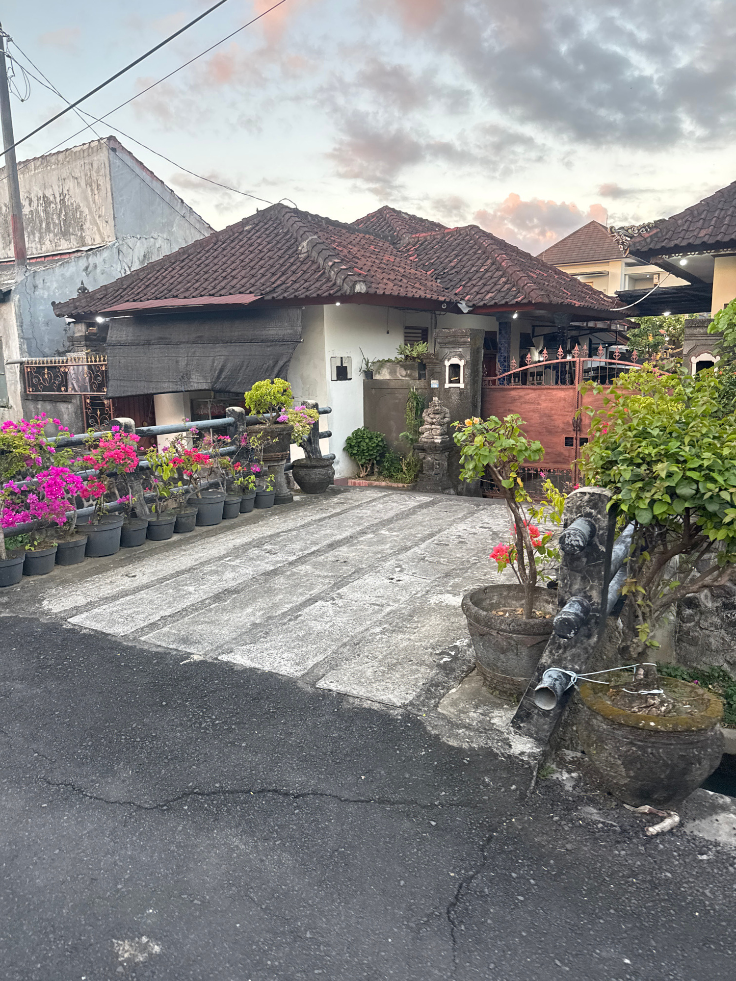 The image depicts a street scene in Denpasar, Indonesia, showcasing Balinese architecture and landscaping. A row of potted bougainvillea flowers lines the walkway, adding vibrant color. A traditional…read more