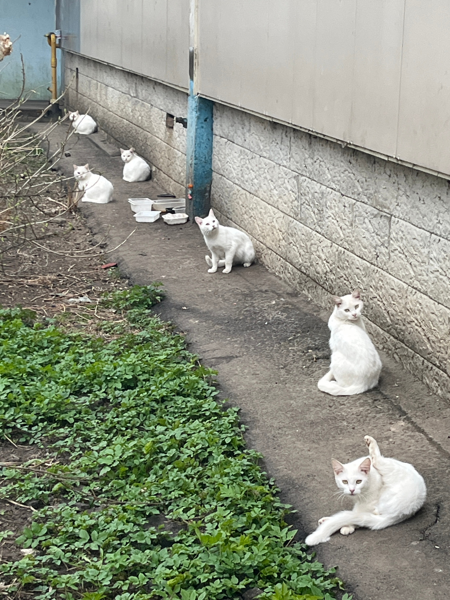 Six white cats are positioned along the base of a building, adjacent to a concrete walkway and a patch of green ground cover. The building appears to be constructed of gray, horizontal panels. The wal…read more