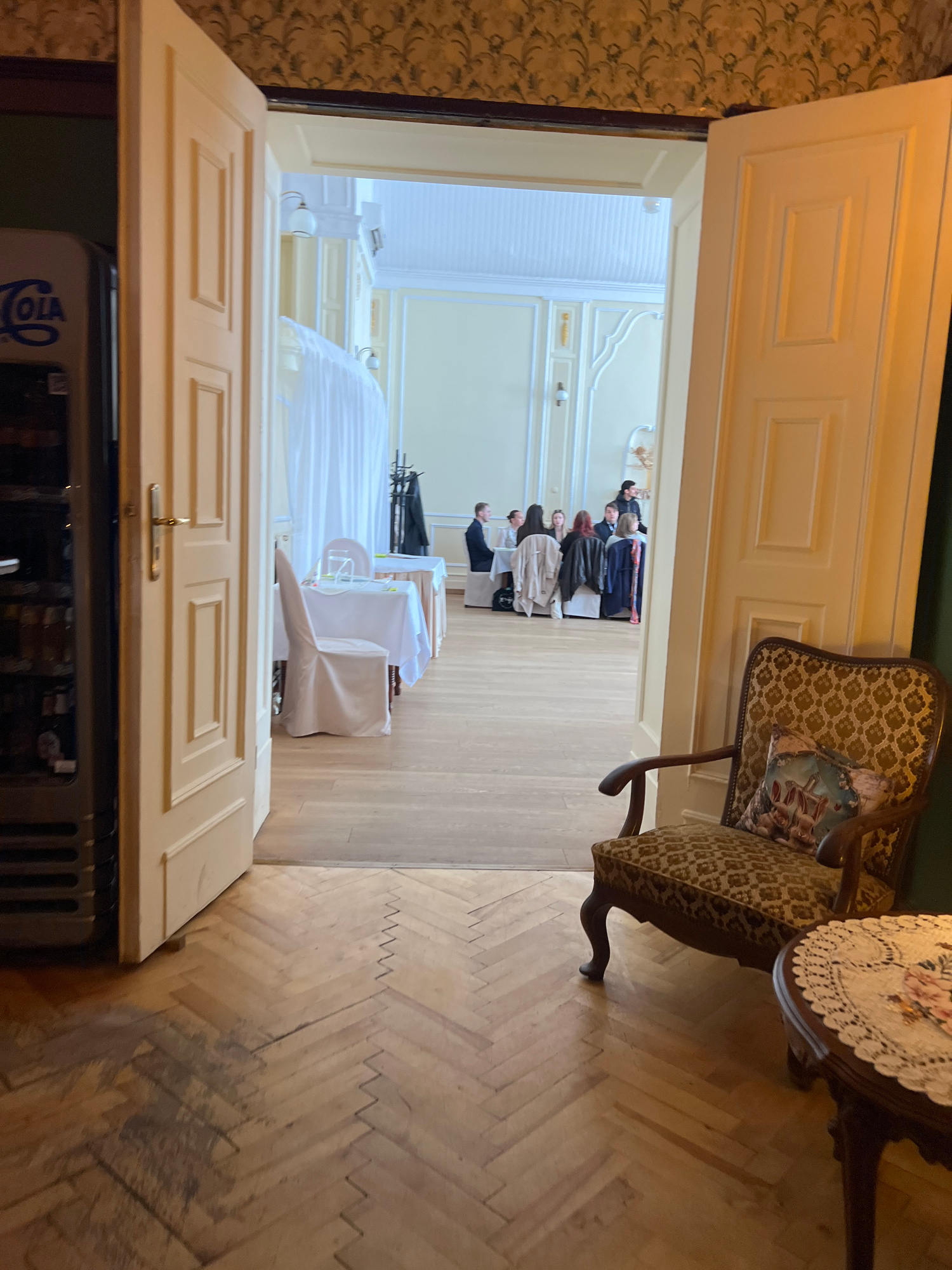 A partial view through an open, paneled, painted door reveals an interior space in Bydgoszcz, Poland. Through the doorway, a group of people stand in an orderly fashion, likely waiting or observing so…read more