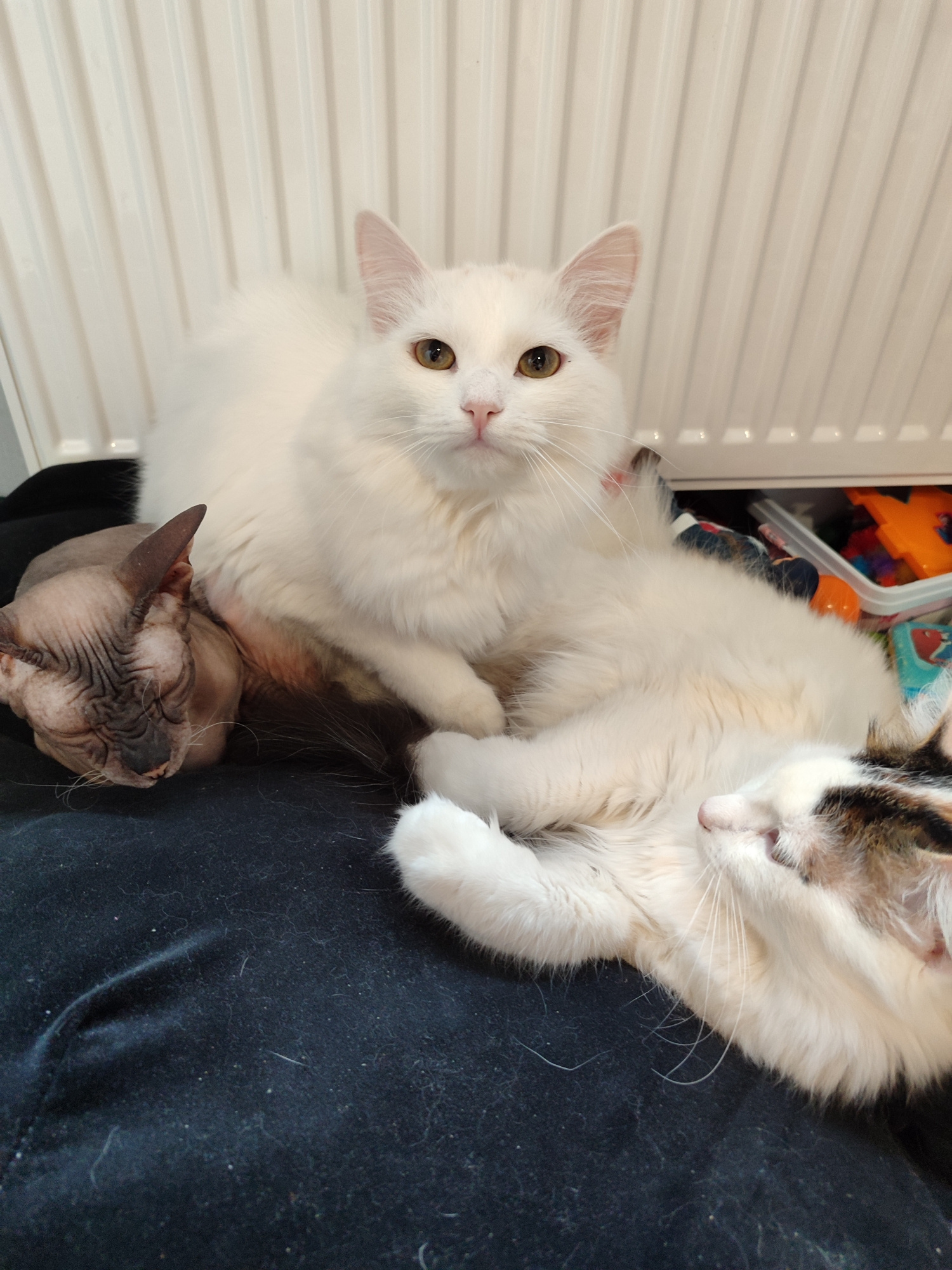 This indoor portrait features three cats of different breeds and colors resting together in a cozy, domestic setting, likely in Izhevsk, Russia. In the prominent central position, a fluffy white longβ¦read more