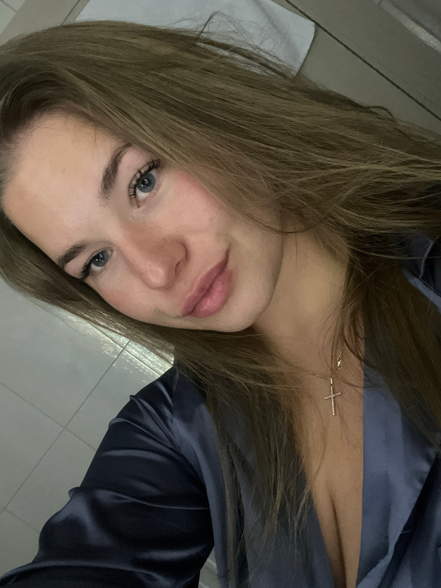 A young woman with long, light brown hair and blue eyes is posing for a selfie. She is wearing a dark-colored, possibly satin, top or robe, and a delicate silver cross necklace is visible on her chest…read more