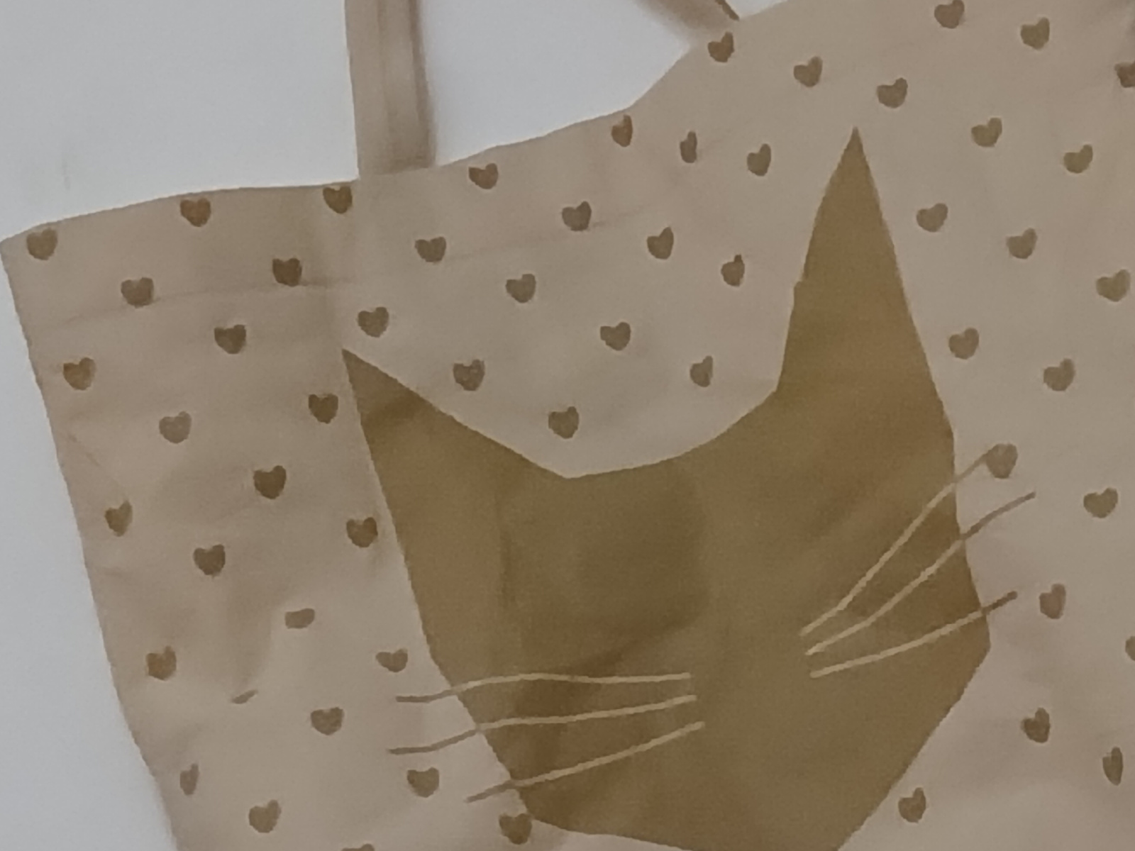 The image shows a close-up of a light beige fabric with a pattern of small, brown heart shapes. A larger, solid brown design of a stylized cat face with whiskers is also present on the fabric. The edg…read more