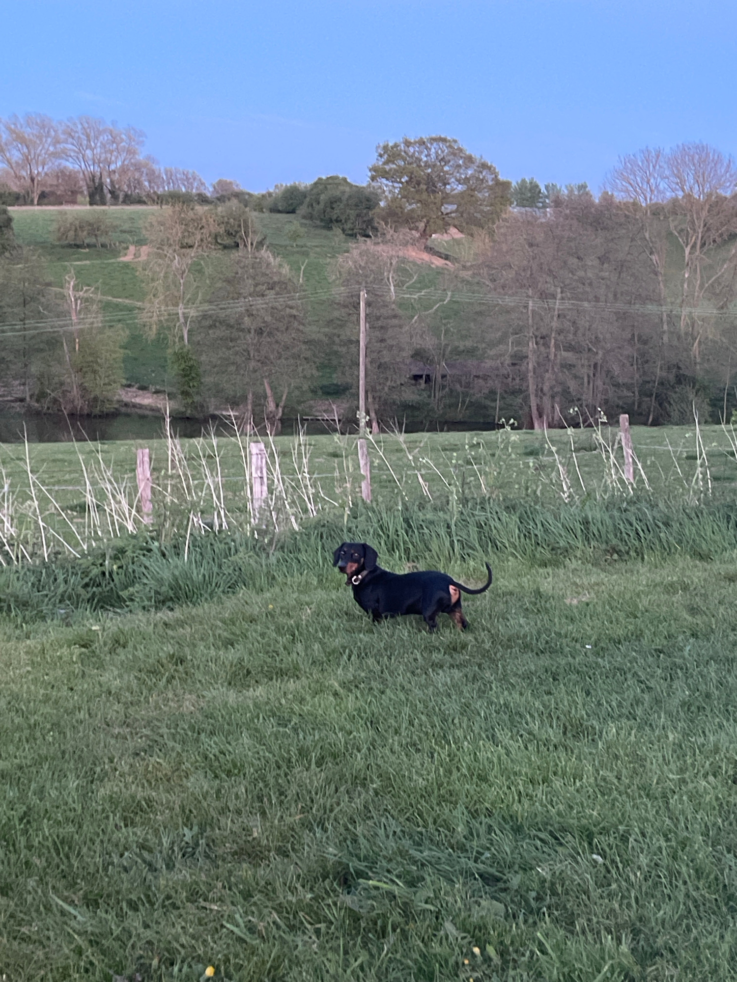 The image depicts a black and tan dachshund standing in a field of green grass. A wooden fence runs through the middle ground of the image, partially obscured by tall white weeds. Beyond the fence, thβ¦read more