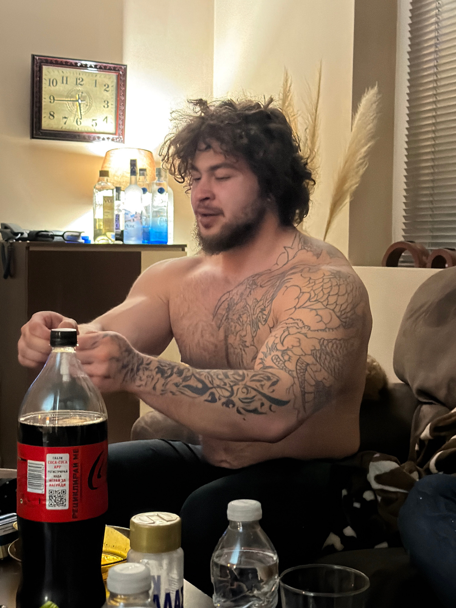 A man with tattoos is opening a bottle of Coca-Cola. He is shirtless, and the tattoos cover his arms and upper back. There is a clock on the wall indicating the time of 11:08, and several bottles of w…read more