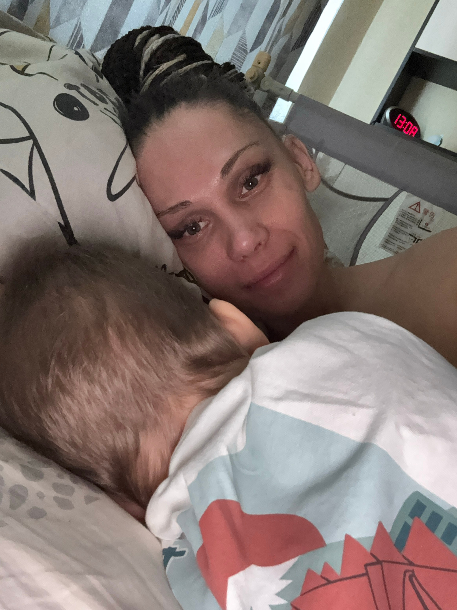 A woman and a child are lying in bed together. The woman is awake and looking at the camera. She has dark hair pulled back in braids. The child is asleep, covered with a blanket. A digital clock displ…read more