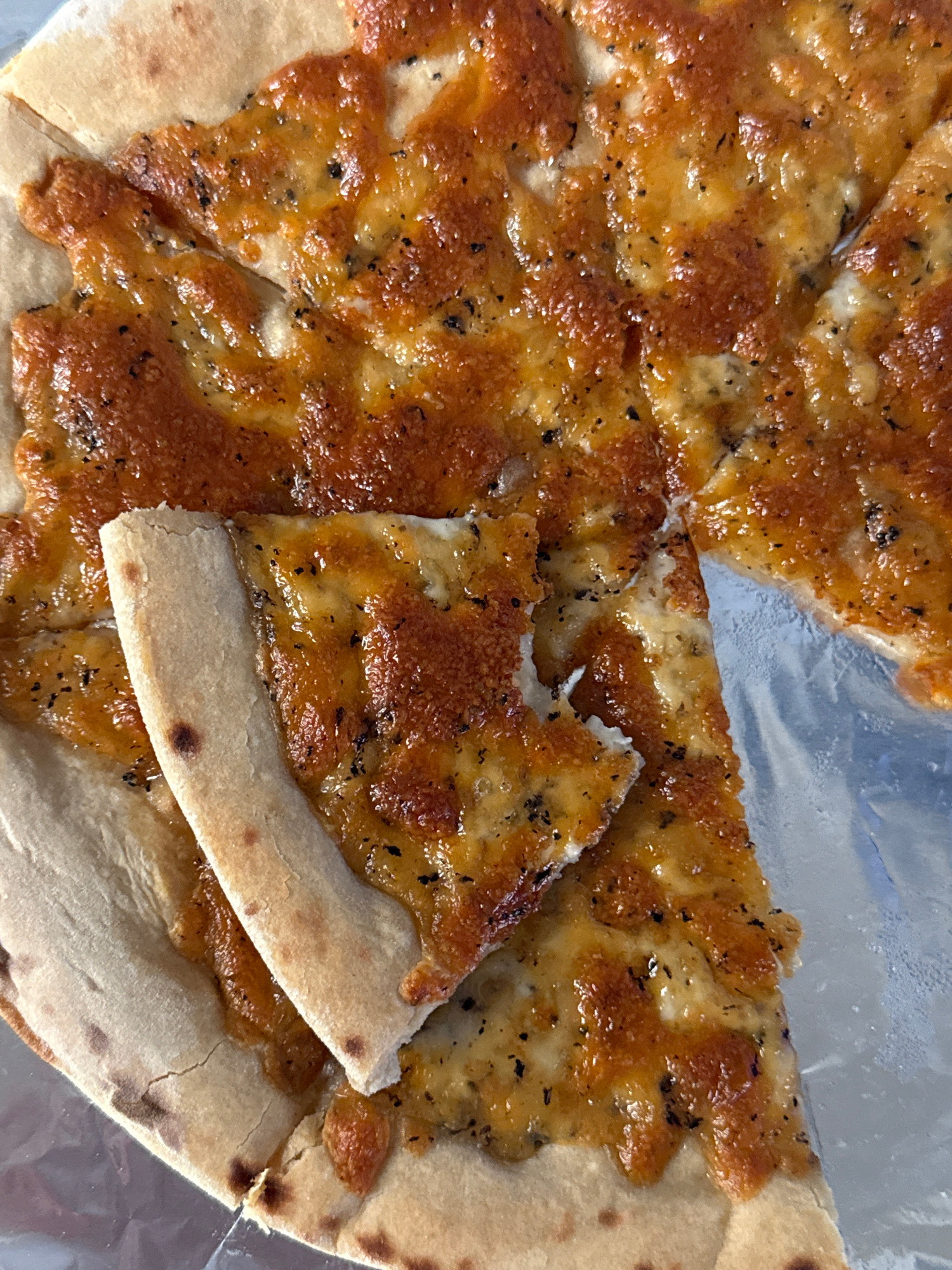 The image shows a close-up of a partially eaten pizza with a golden-brown, glossy topping and visible herbs or spices, sliced into irregular pieces. The crust is a pale beige color with dark spots. Th…read more
