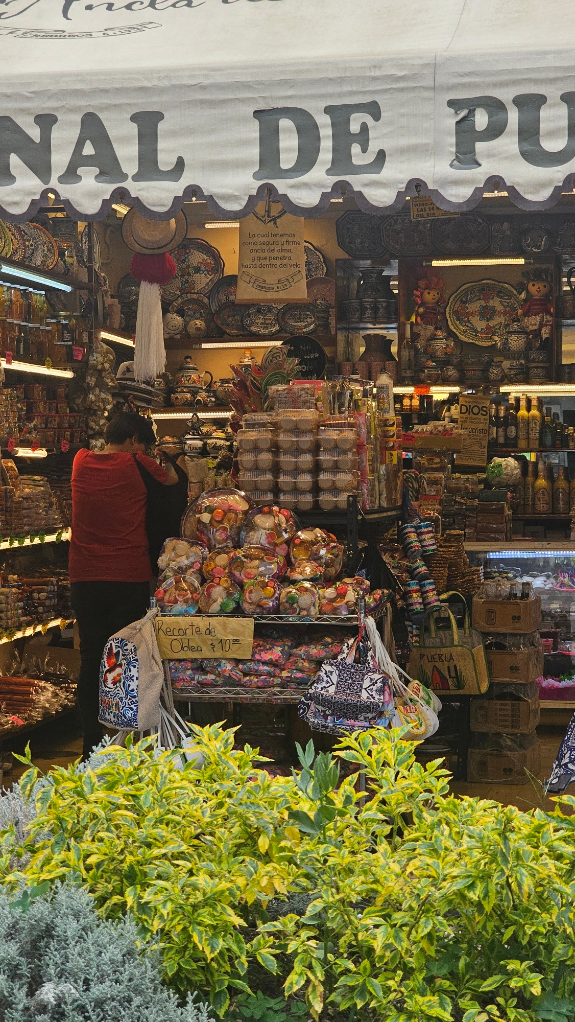 This image captures a vibrant street scene in Puebla, Mexico, showcasing a local shop or market stall filled with traditional goods. The setting appears to be outdoors, with lush green and yellow variβ¦read more