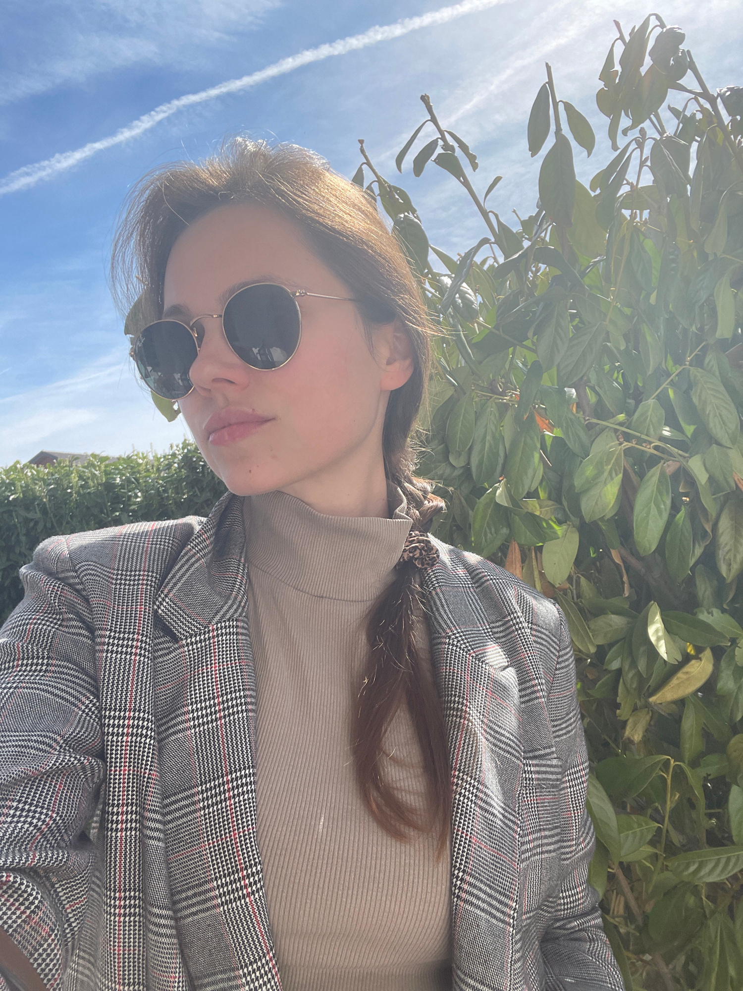 A young woman wearing sunglasses and a plaid blazer stands outside on a sunny day. She is positioned in front of a green leafy bush with the blue sky and contrails visible above. It is not possible to…read more
