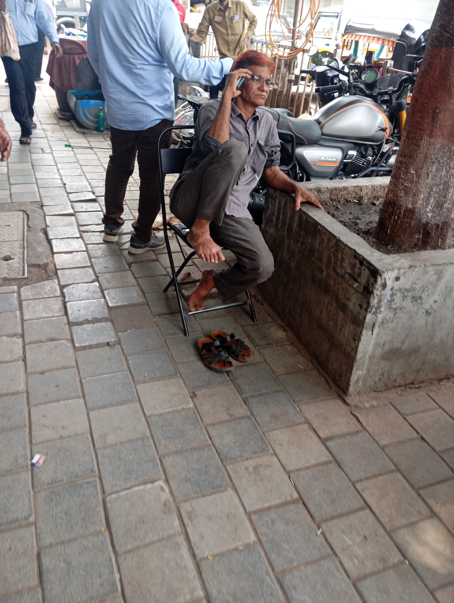 On a public Mumbai, India thoroughfare composed of gray-toned concrete blocks, an older man with auburn-dyed hair and wearing spectacles is seated on a black folding chair and appears to be using a mo…read more