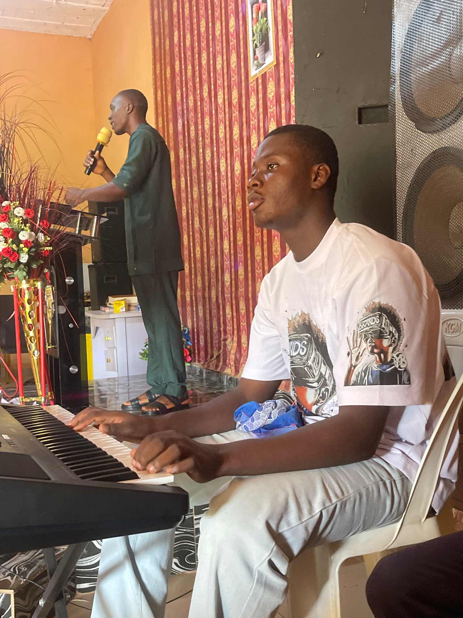A medium, indoor shot depicts two people in a room where one person is playing a keyboard while another person sings into a microphone. The person playing the keyboard is a dark-skinned man in a whit…read more
