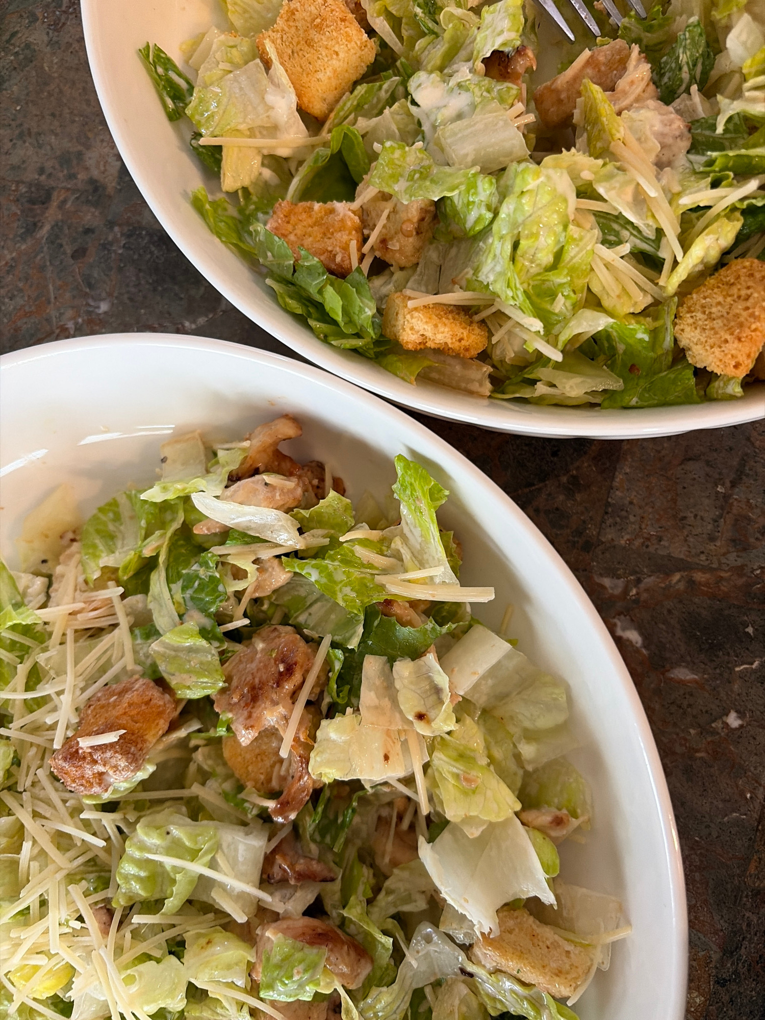 Two white bowls containing Caesar salad are positioned on a dark brown marbled surface. The salad consists of chopped romaine lettuce, croutons, parmesan cheese shavings, and Caesar dressing. A fork i…read more