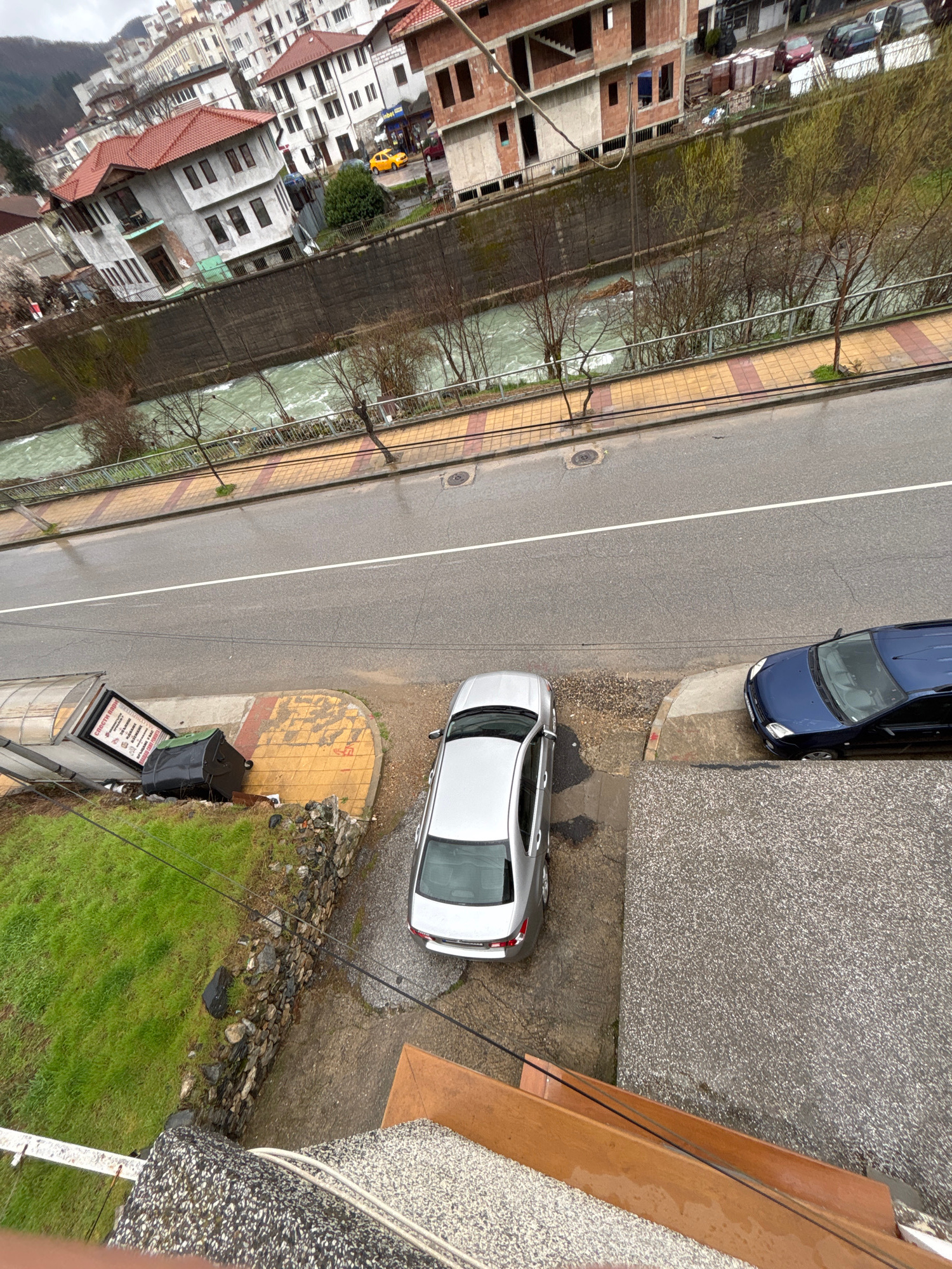 The image is a high-angle view of a street scene in Zlatograd, Bulgaria. A two-lane road runs parallel to a river. Buildings, including an unfinished construction site, are visible on the opposite sid…read more