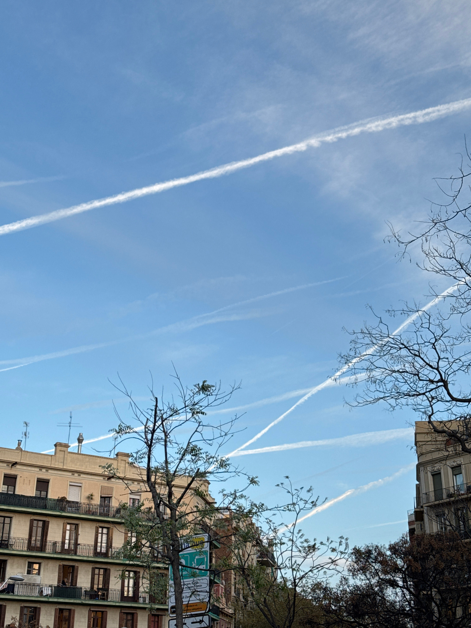 The image presents an urban landscape primarily focused on the sky above a street in Barcelona, Spain. The upper two-thirds of the frame are filled with a clear, bright blue sky containing numerous wh…read more