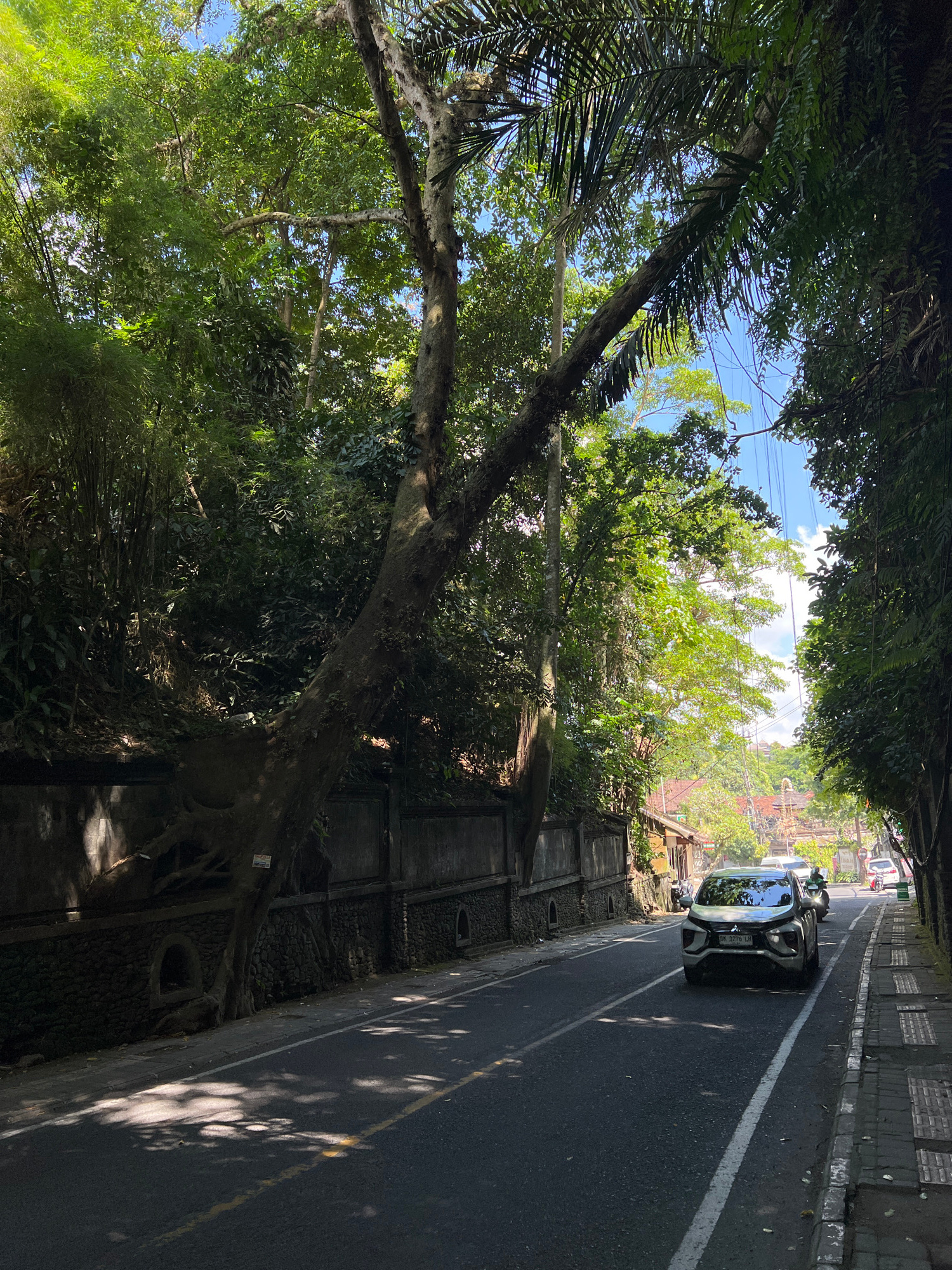A street scene, likely in Ubud, Indonesia, showing a car parked on the side of a narrow road bordered by a low stone wall with recessed panels. The road leads into a brighter area with buildings visib…read more