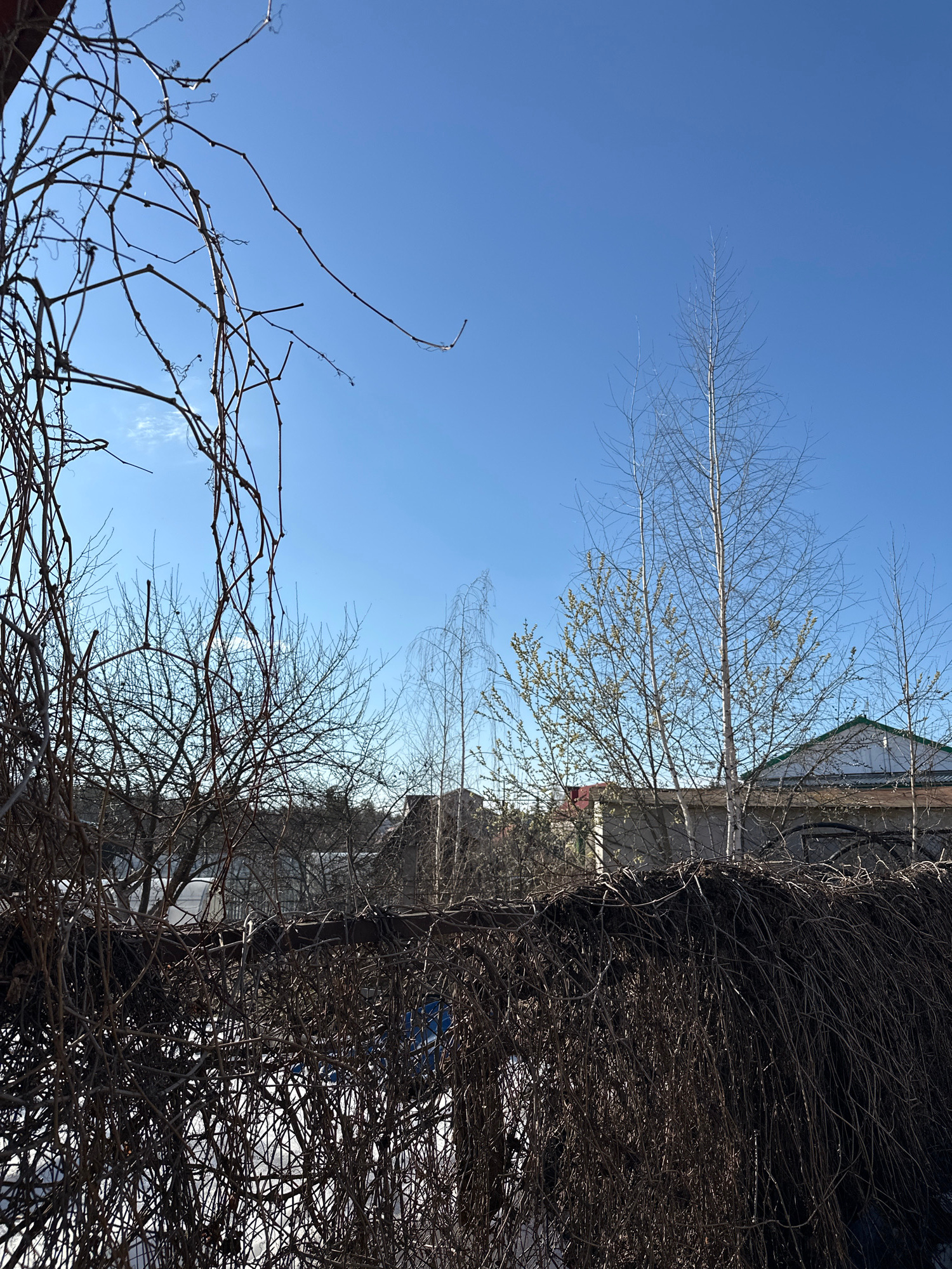The image shows a view of a building partially obscured by branches, potentially in the city of Noviy, Russia. The sky is visible in the background. Some trees are budding. A mass of tangled branches…read more