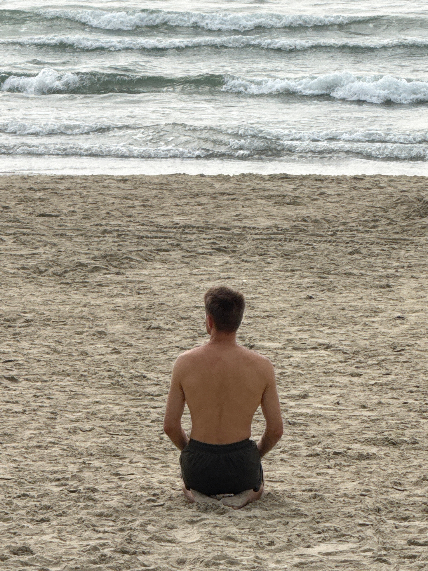 The image displays a shirtless adult male, viewed from the back, seated on a sandy beach. He wears dark-colored shorts and has short, brown hair. His knees are bent, and he faces directly towards the…read more