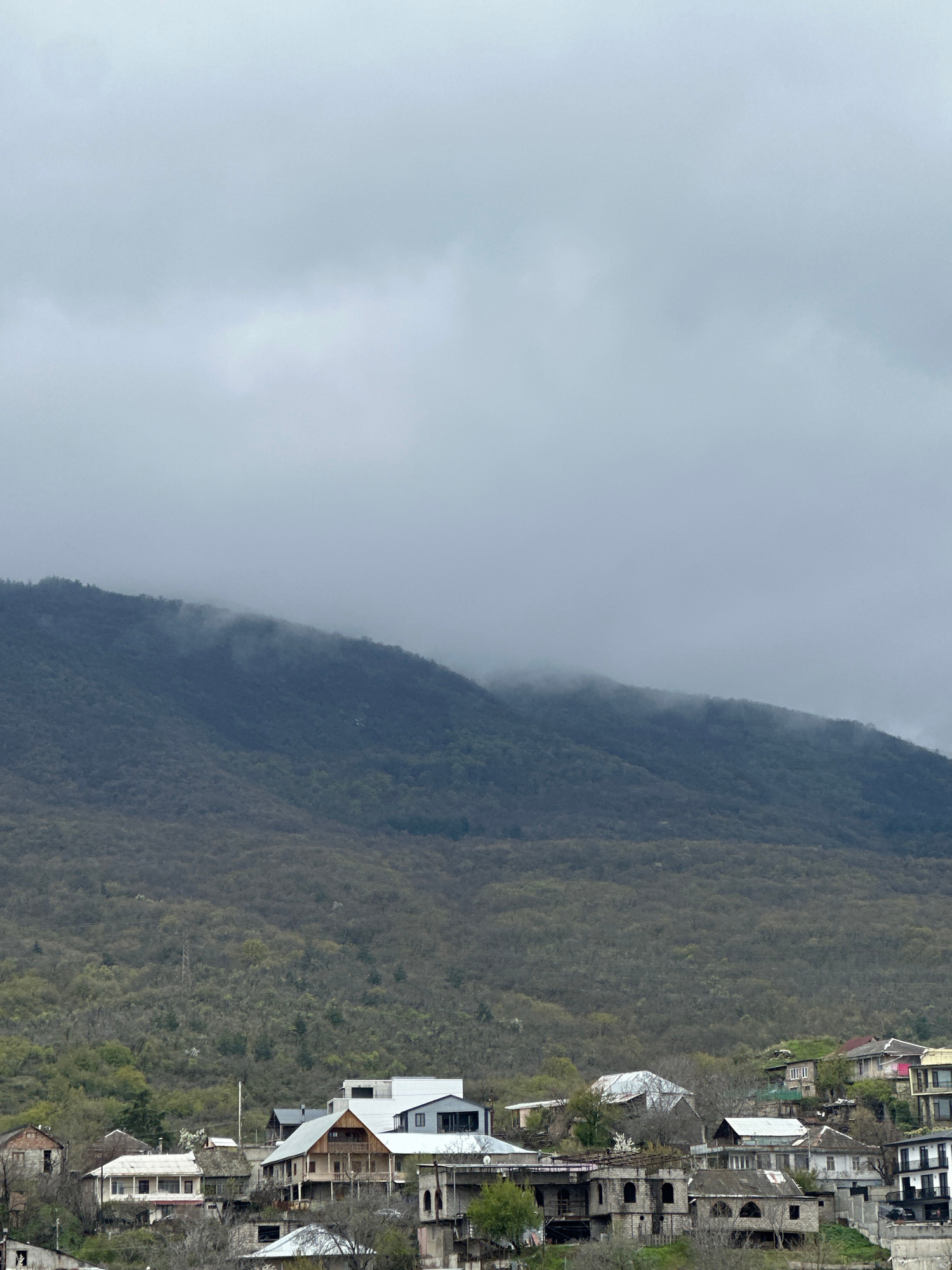 The image shows a cityscape nestled against a mountainside in Tbilisi, Georgia. Buildings of varying architectural styles are arranged vertically along the right side of the frame, ranging from modern…read more