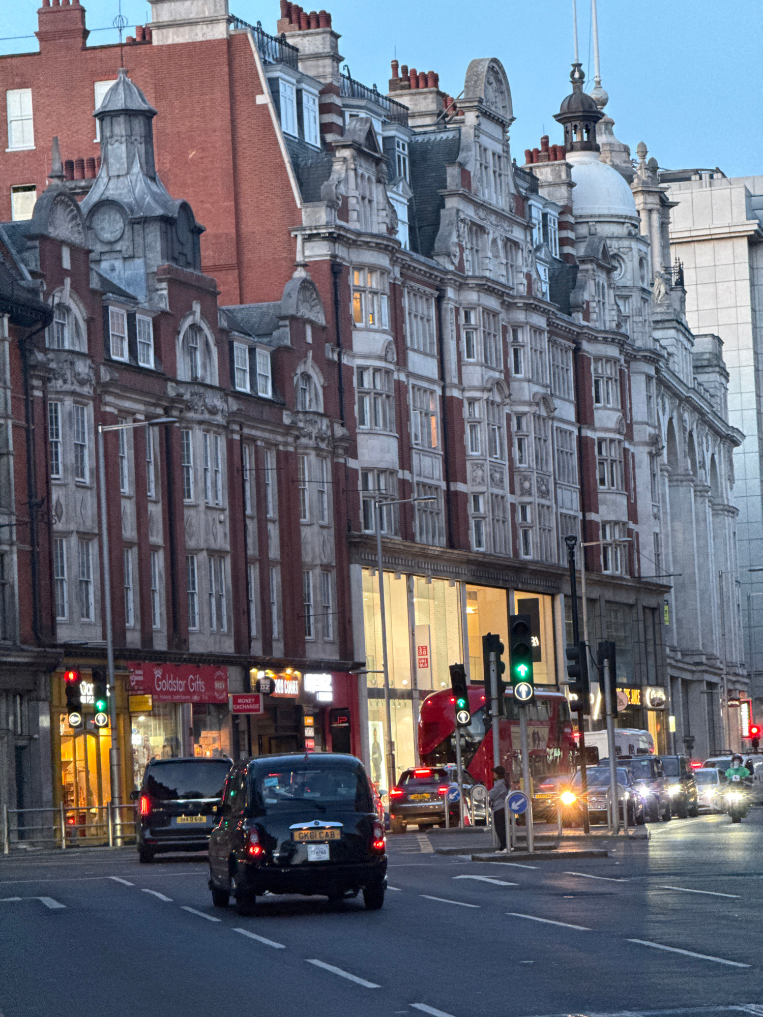 The image shows a street scene in London, United Kingdom. The architecture is notable, with a large, ornate building occupying a significant portion of the frame. The building has a primarily white fa…read more