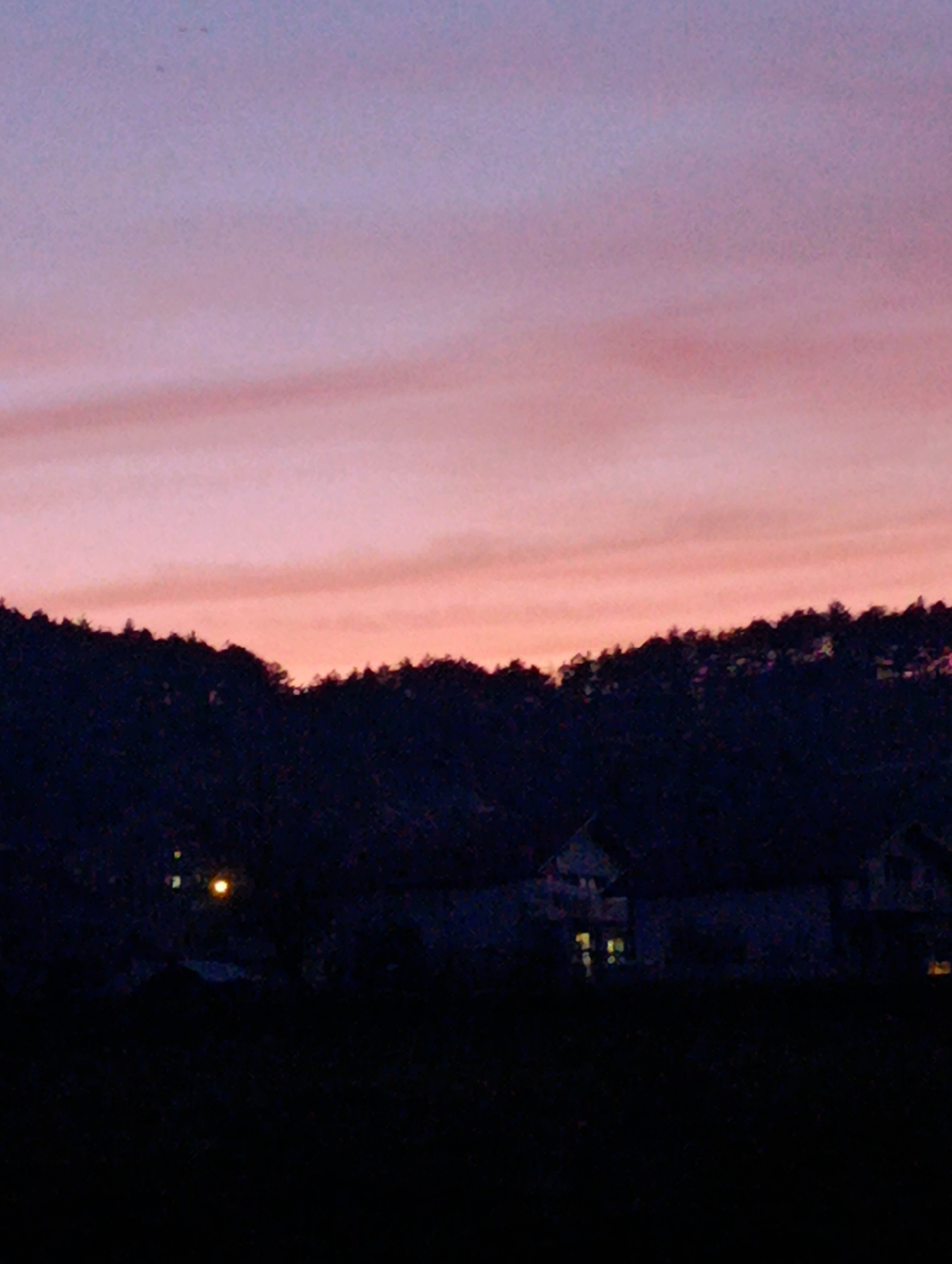 The image shows a dusky landscape with a colorful, layered sky transitioning from pink to purple. A dark, silhouetted line of trees or foliage separates the sky from the lower portion of the image. Be…read more
