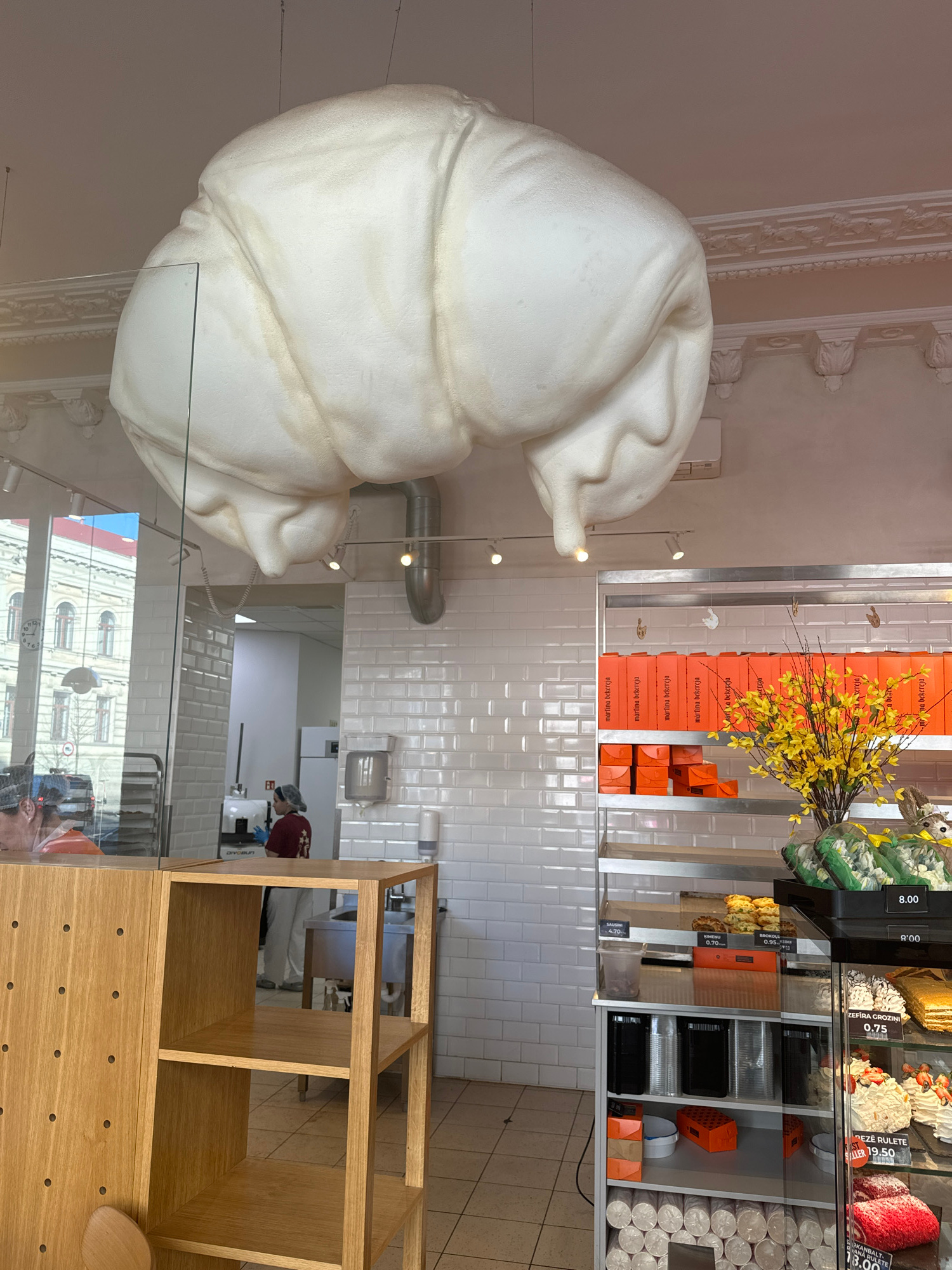 The image shows the interior of a bakery or pastry shop, likely in Riga, Latvia, considering the "martina bekereja" branding. A large, cloud-like or abstract white sculpture hangs from the ceiling on…read more