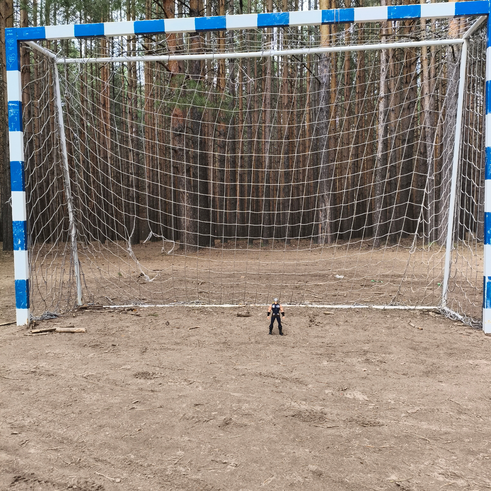 The image depicts a soccer goal situated on a dirt field in front of a pine forest. The goalposts are painted with alternating blue and white stripes. A white net is stretched across the goal frame. I…read more