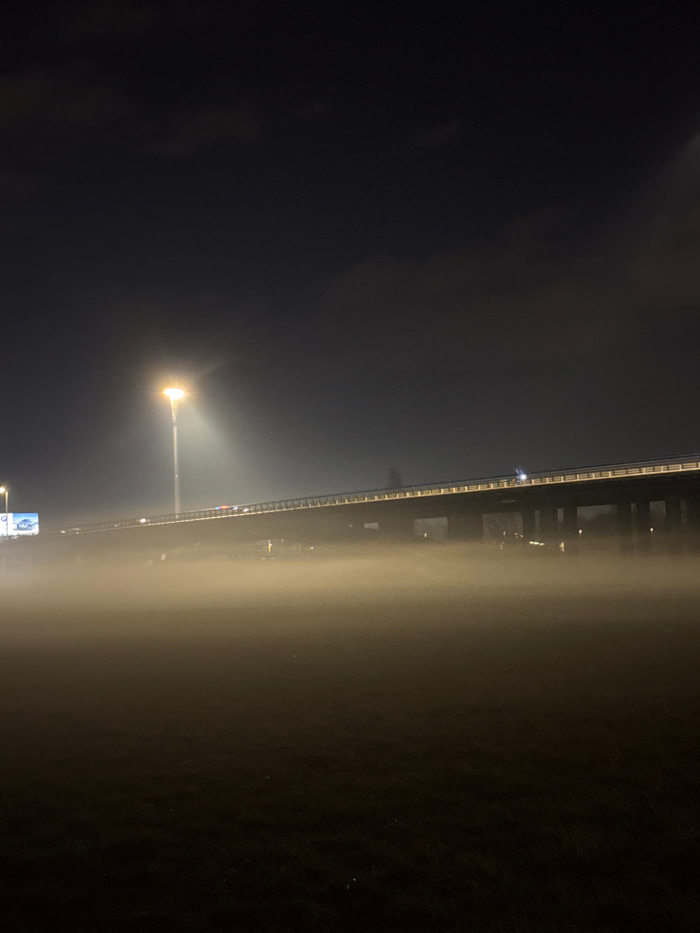 The scene depicts an elevated highway overpass enveloped in heavy fog at night, located in the Novi Zagreb district, City of Zagreb, Croatia. The foreground features a dark, likely grassy field, obscu…read more